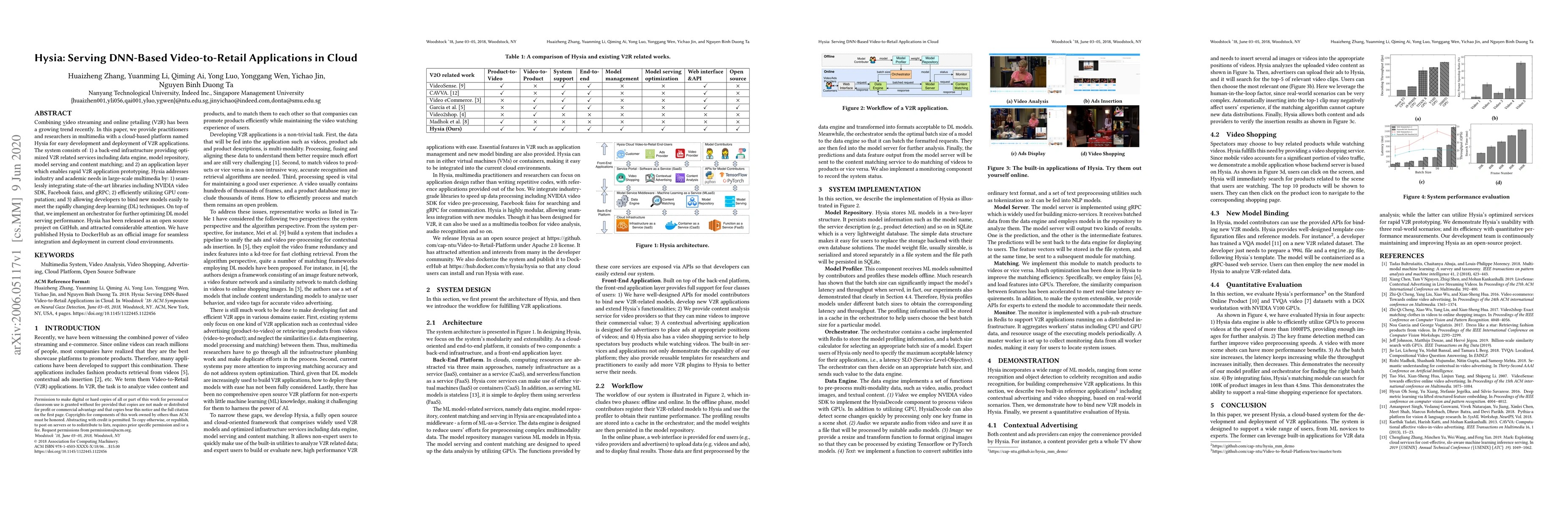 Combining \underline{v}ideo streaming and online \underline{r}etailing (V2R) has been a growing trend recently. In this paper, we provide practitioners and researchers in multimedia with a cloud-based platform named Hysia for easy development and deployment of V2R applications. The system consists of: 1) a back-end infrastructure providing optimized V2R related services including data engine, model repository, model serving and content matching; and 2) an application layer which enables rapid V2R application prototyping. Hysia addresses industry and academic needs in large-scale multimedia by: 1) seamlessly integrating state-of-the-art libraries including NVIDIA video SDK, Facebook faiss, and gRPC; 2) efficiently utilizing GPU computation; and 3) allowing developers to bind new models easily to meet the rapidly changing deep learning (DL) techniques. On top of that, we implement an orchestrator for further optimizing DL model serving performance. Hysia has been released as an open source project on GitHub, and attracted considerable attention. We have published Hysia to DockerHub as an official image for seamless integration and deployment in current cloud environments.