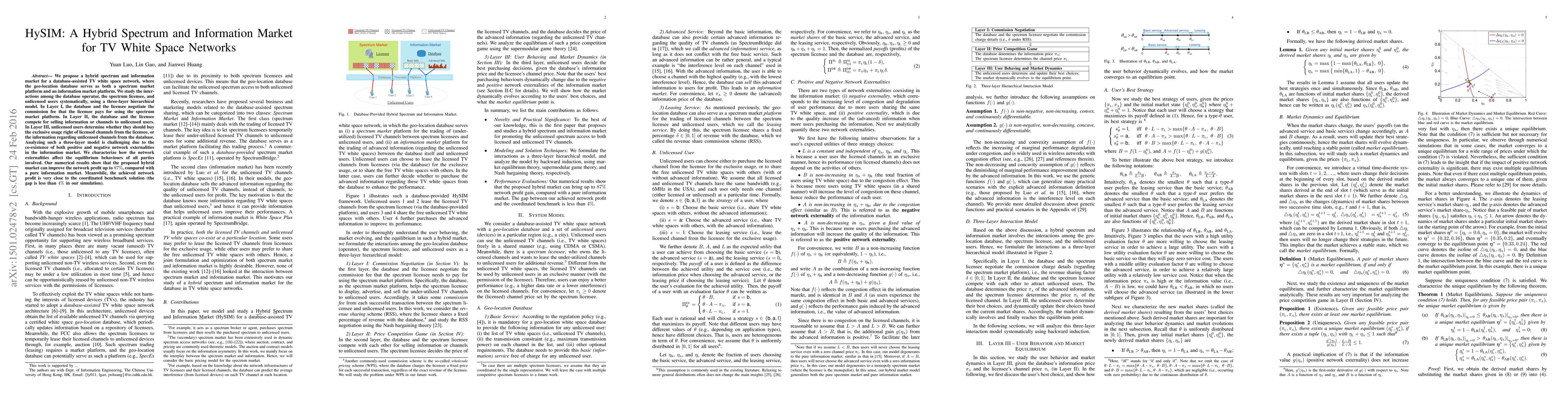 The paper proposes a hybrid spectrum and information market for TV white space networks, analyzing interactions among the database operator, spectrum licensee, and unlicensed users through a three-layer hierarchical model. The hybrid market can improve network profit by up to 87% compared to a pure information market, with near-optimal performance.