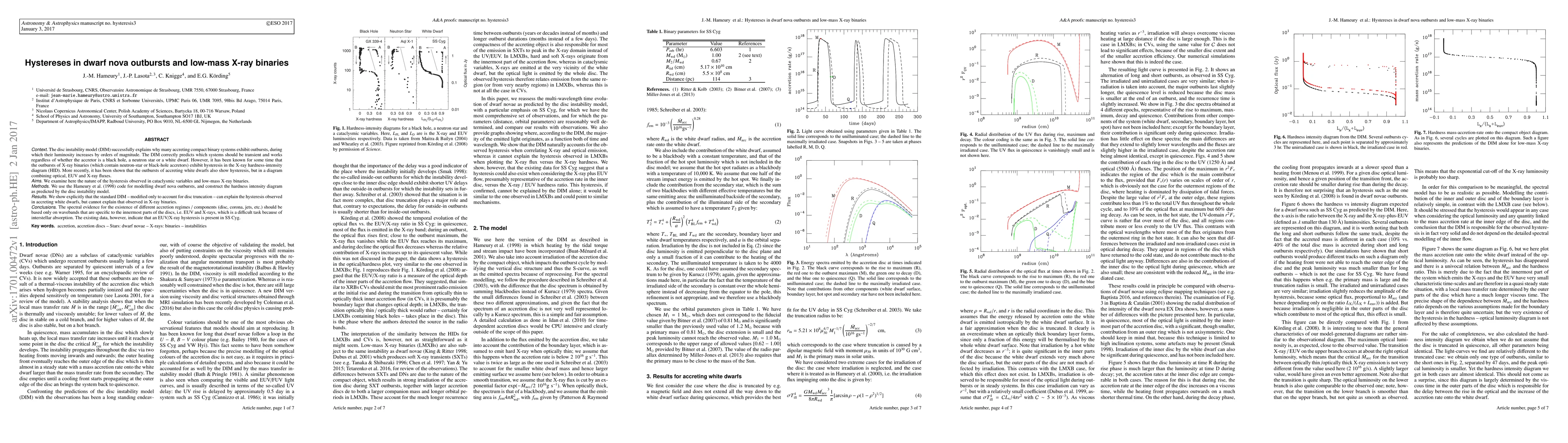 This paper investigates the hysteresis observed in the outbursts of dwarf novae and low-mass X-ray binaries using the disc instability model, finding that while the model explains hysteresis in accreting white dwarfs, it fails for X-ray binaries. It concludes that spectral evidence for different accretion regimes should rely on EUV and X-ray wavebands, though interstellar absorption complicates this.
