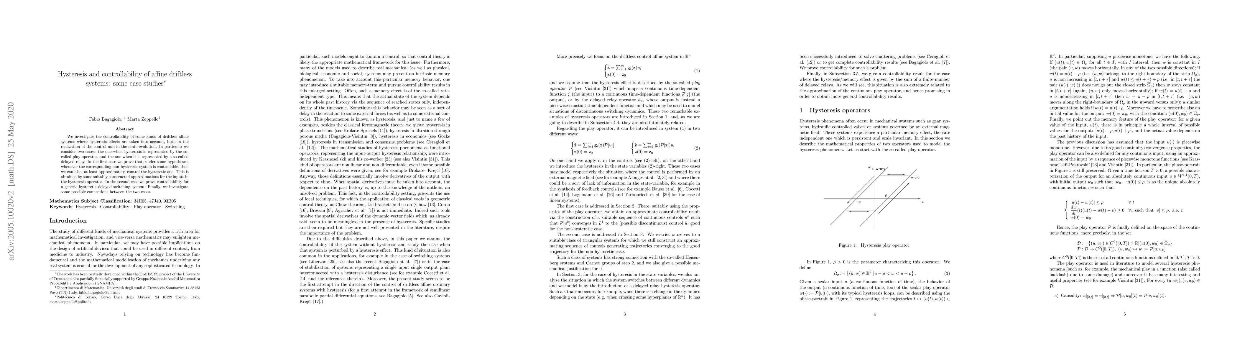 We investigate the controllability of some kinds of driftless affine systems where hysteresis effects are taken into account, both in the realization of the control and in the state evolution. In particular we consider two cases: the one when hysteresis is represented by the so-called play operator, and the one when it is represented by a so-called delayed relay. In the first case we prove that, under some hypotheses, whenever the corresponding non-hysteretic system is controllable, then we can also, at least approximately, control the hysteretic one. This is obtained by some suitably constructed approximations for the inputs in the hysteresis operator. In the second case we prove controllability for a generic hysteretic delayed switching system. Finally, we investigate some possible connections between the two cases.