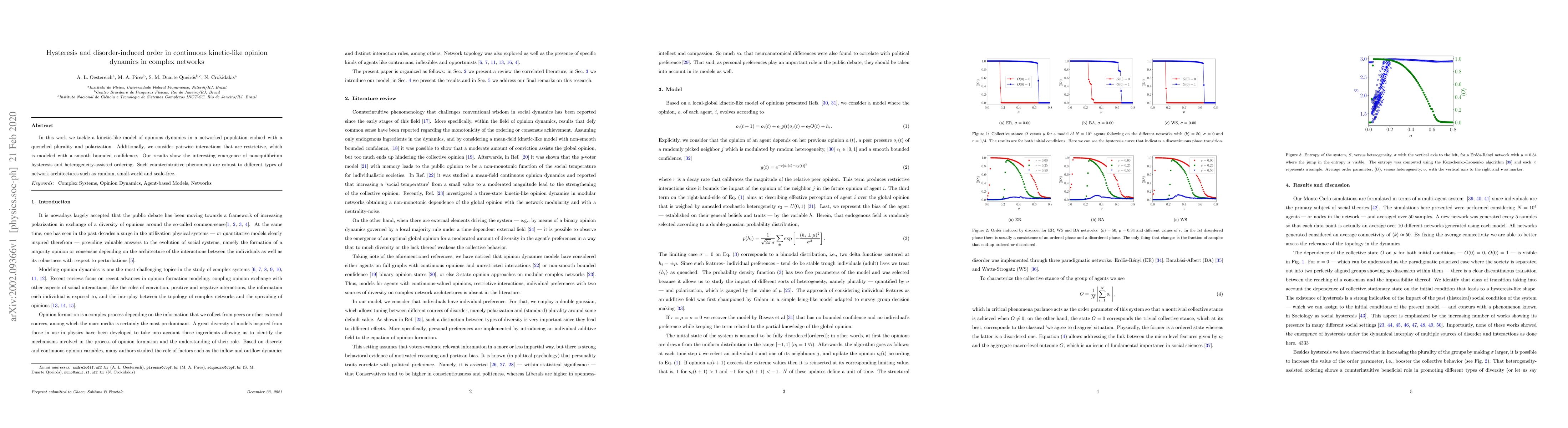 In this work we tackle a kinetic-like model of opinions dynamics in a networked population endued with a quenched plurality and polarization. Additionally, we consider pairwise interactions that are restrictive, which is modeled with a smooth bounded confidence. Our results show the interesting emergence of nonequilibrium hysteresis and heterogeneity-assisted ordering. Such counterintuitive phenomena are robust to different types of network architectures such as random, small-world and scale-free.