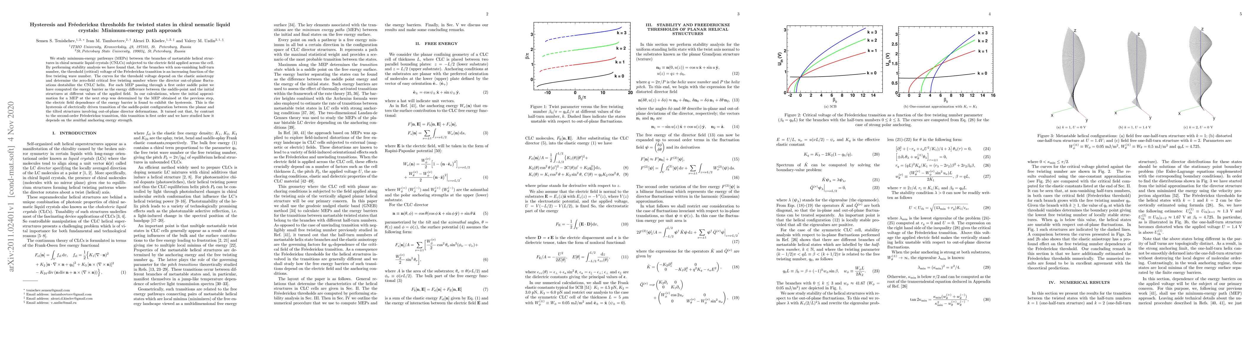 We study minimum-energy pathways (MEPs) between the branches of metastable helical structures in chiral nematic liquid crystals (CNLCs)subjected to the electric field applied across the cell. By performing stability analysis we have found that, for the branches with non-vanishing half-turn number, the threshold (critical) voltage of the Freedericksz transition is an increasing function of the free twisting wave number. The curves for the threshold voltage depend on the elastic anisotropy and determine the zero-field critical free twisting number where the director out-of-plane fluctuations destabilize the CNLC helix. For each MEP passing through a first order saddle point we have computed the energy barrier as the energy difference between the saddle-point and the initial structures at different values of the applied field. In our calculations, where the initial approximation for a MEP at the next step was determined by the MEP obtained at the previous step, the electric field dependence of the energy barrier is found to exhibit the hysteresis. This is the hysteresis of electrically driven transition of the saddle-point configuration between the planar and the tilted structures involving out-of-plane director deformations. It turned out that, by contrast to the second-order Freedericksz transition, this transition is first order and we have studied how it depends on the zenithal anchoring energy strength.