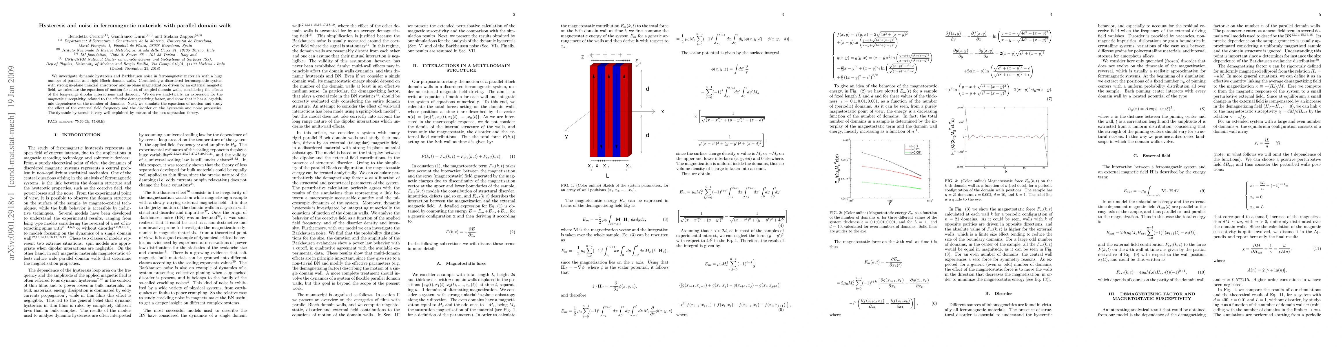 We investigate dynamic hysteresis and Barkhausen noise in ferromagnetic materials with a huge number of parallel and rigid Bloch domain walls. Considering a disordered ferromagnetic system with strong in-plane uniaxial anisotropy and in-plane magnetization driven by an external magnetic field, we calculate the equations of motion for a set of coupled domain walls, considering the effects of the long-range dipolar interactions and disorder. We derive analytically an expression for the magnetic susceptivity, related to the effective demagnetizing factor, and show that it has a logarithmic dependence on the number of domains. Next, we simulate the equations of motion and study the effect of the external field frequency and the disorder on the hysteresis and noise properties. The dynamic hysteresis is very well explained by means of the loss separation theory.