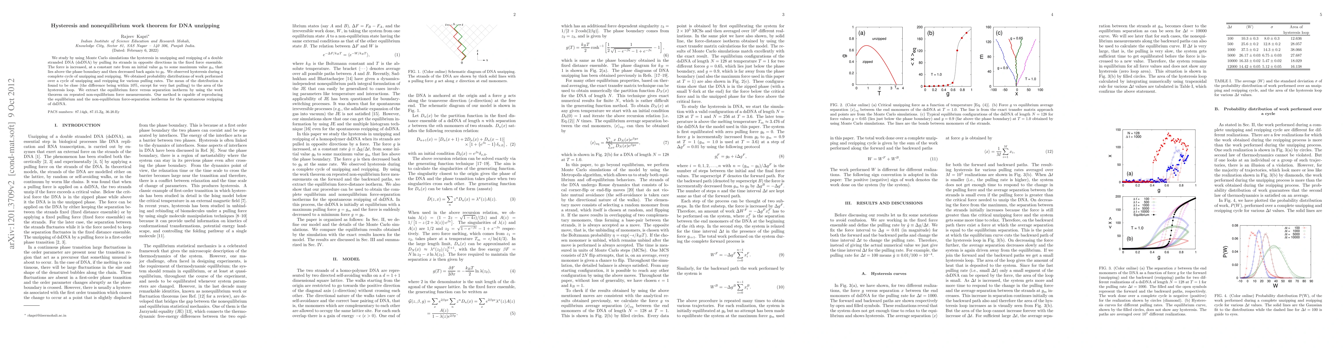 This paper investigates the hysteresis effects in DNA unzipping and rezipping using Monte Carlo simulations, finding that the mean work distribution closely matches the hysteresis loop area. The study also applies a nonequilibrium work theorem to extract the equilibrium force-separation isotherm for dsDNA rezipping.