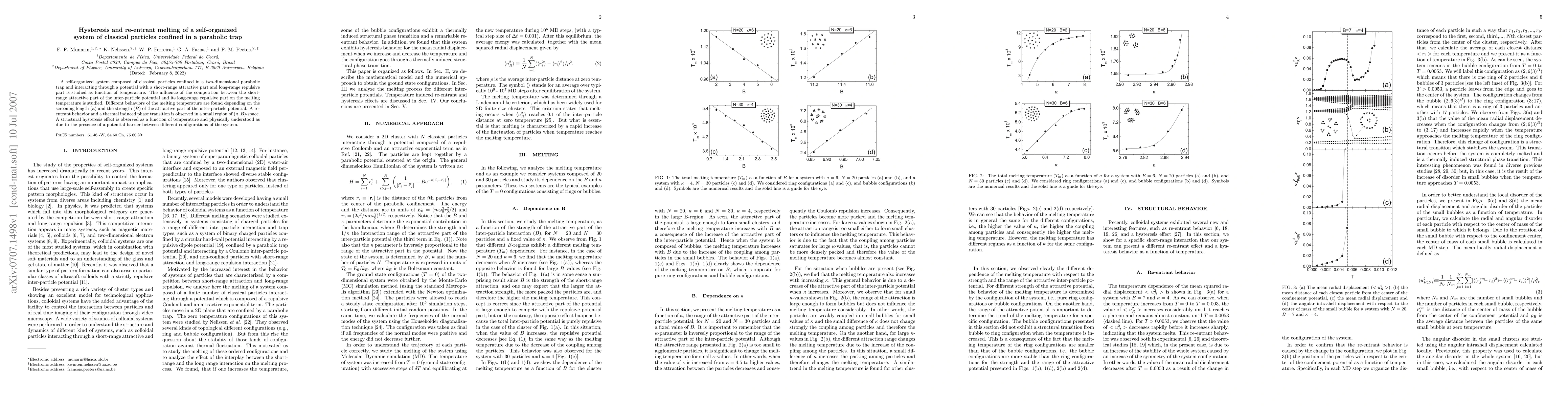 Researchers studied a system of particles in a parabolic trap with short-range attraction and long-range repulsion, finding re-entrant behavior and thermal-induced phase transitions; they also discovered structural hysteresis due to potential barriers.