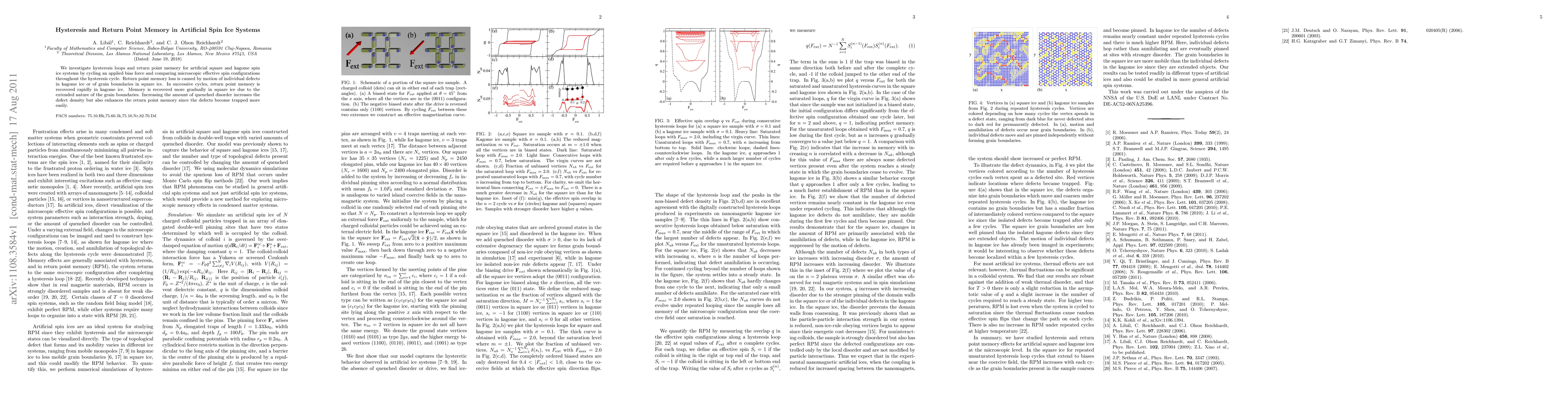 This paper examines hysteresis and return point memory in artificial spin ice systems, finding that memory loss in kagome ice is due to defect motion, while in square ice it's due to grain boundaries. Kagome ice rapidly recovers memory in successive cycles, whereas square ice does so gradually due to extended grain boundaries; increased disorder enhances memory by trapping defects more effectively.