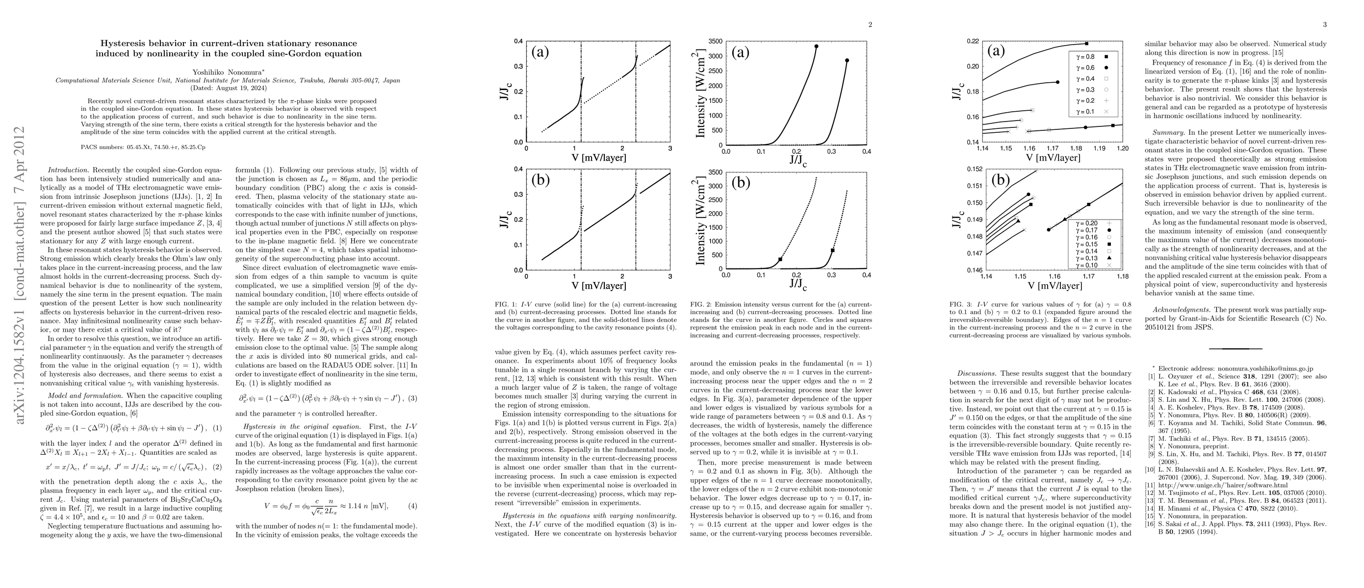 Recently novel current-driven resonant states characterized by the $\pi$-phase kinks were proposed in the coupled sine-Gordon equation. In these states hysteresis behavior is observed with respect to the application process of current, and such behavior is due to nonlinearity in the sine term. Varying strength of the sine term, there exists a critical strength for the hysteresis behavior and the amplitude of the sine term coincides with the applied current at the critical strength.