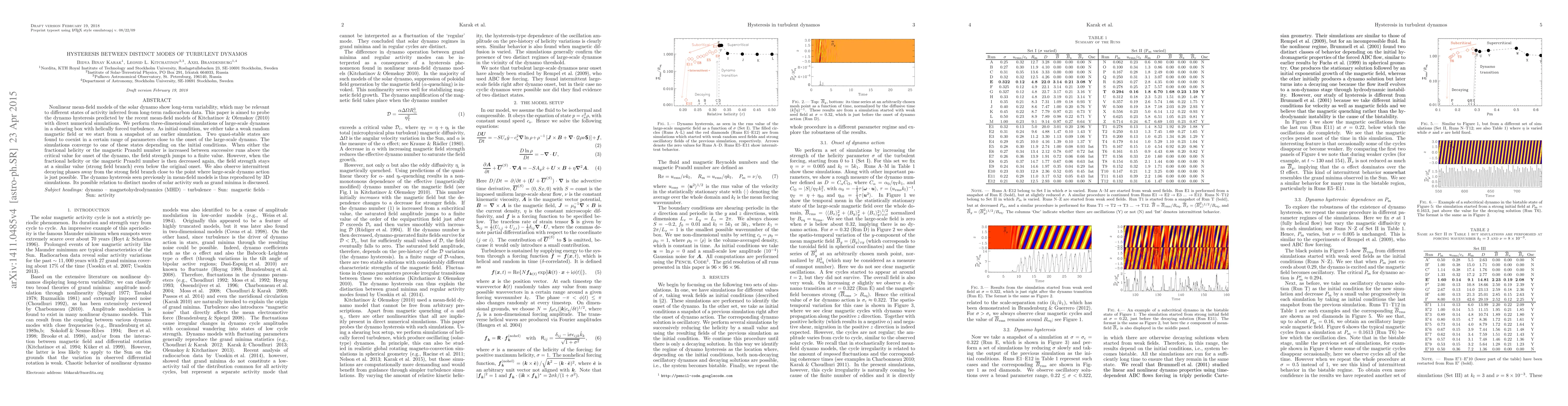 Nonlinear mean-field models of the solar dynamo show long-term variability, which may be relevant to different states of activity inferred from long-term radiocarbon data. This paper is aimed to probe the dynamo hysteresis predicted by the recent mean-field models of Kitchatinov \& Olemskoy (2010) with direct numerical simulations. We perform three-dimensional simulations of large-scale dynamos in a shearing box with helically forced turbulence. As initial condition, we either take a weak random magnetic field or we start from a snapshot of an earlier simulation. Two quasi-stable states are found to coexist in a certain range of parameters close to the onset of the large-scale dynamo. The simulations converge to one of these states depending on the initial conditions. When either the fractional helicity or the magnetic Prandtl number is increased between successive runs above the critical value for onset of the dynamo, the field strength jumps to a finite value. However, when the fractional helicity or the magnetic Prandtl number is then decreased again, the field strength stays at a similar value (strong field branch) even below the original onset. We also observe intermittent decaying phases away from the strong field branch close to the point where large-scale dynamo action is just possible. The dynamo hysteresis seen previously in mean-field models is thus reproduced by 3D simulations. Its possible relation to distinct modes of solar activity such as grand minima is discussed.