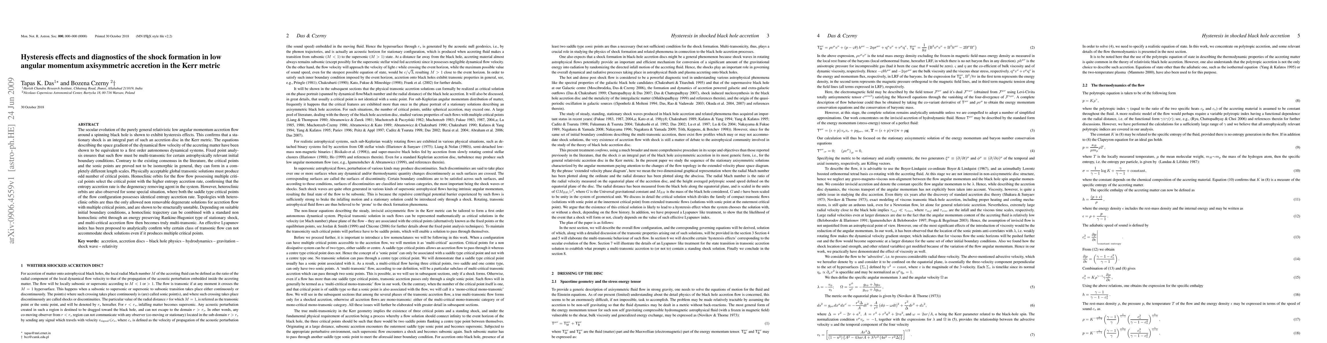 The secular evolution of the purely general relativistic low angular momentum accretion flow around a spinning black hole is shown to exhibit hysteresis effects. This confirms that a stationary shock is an integral part of such an accretion disc in the Kerr metric. The equations describing the space gradient of the dynamical flow velocity of the accreting matter have been shown to be equivalent to a first order autonomous dynamical systems. Fixed point analysis ensures that such flow must be multi-transonic for certain astrophysically relevant initial boundary conditions. Contrary to the existing consensus in the literature, the critical points and the sonic points are proved not to be isomorphic in general. Homoclinic orbits for the flow flow possessing multiple critical points select the critical point with the higher entropy accretion rate, confirming that the entropy accretion rate is the degeneracy removing agent in the system. However, heteroclinic orbits are also observed for some special situation, where both the saddle type critical points of the flow configuration possesses identical entropy accretion rate. Topologies with heteroclinic orbits are thus the only allowed non removable degenerate solutions for accretion flow with multiple critical points, and are shown to be structurally unstable. Depending on suitable initial boundary conditions, a homoclinic trajectory can be combined with a standard non homoclinic orbit through an energy preserving Rankine-Hugoniot type of stationary shock. An effective Lyapunov index has been proposed to analytically confirm why certain class of transonic flow can not accommodate shock solutions even if it produces multiple critical points. (Abridged)