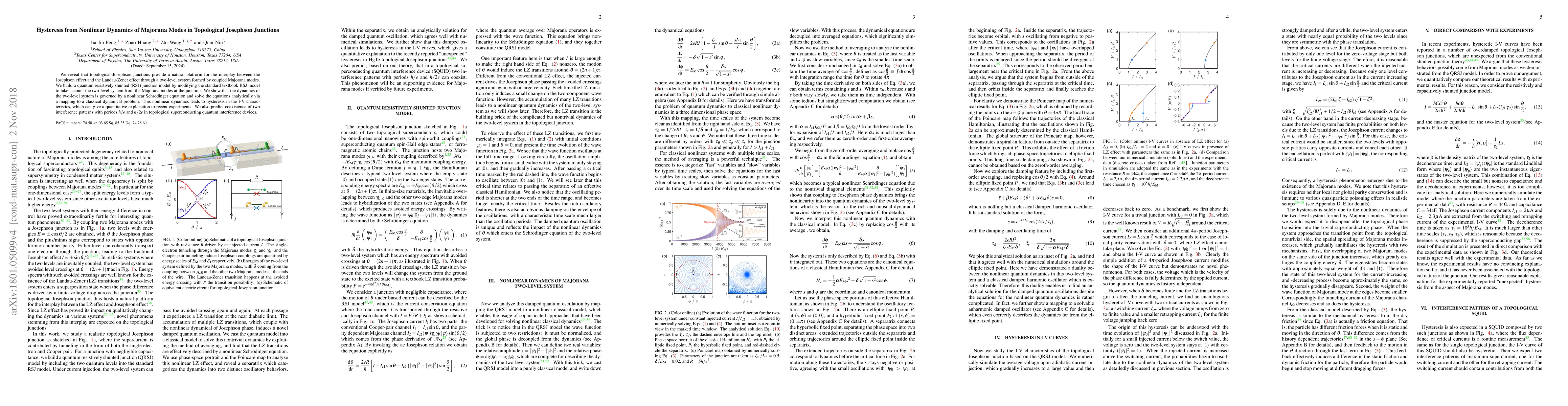 This paper investigates the interplay between the Josephson and Landau-Zener effects in topological Josephson junctions via Majorana modes, revealing hysteresis in I-V characteristics through nonlinear dynamics. The study predicts two distinct interference patterns in topological superconducting quantum interference devices.