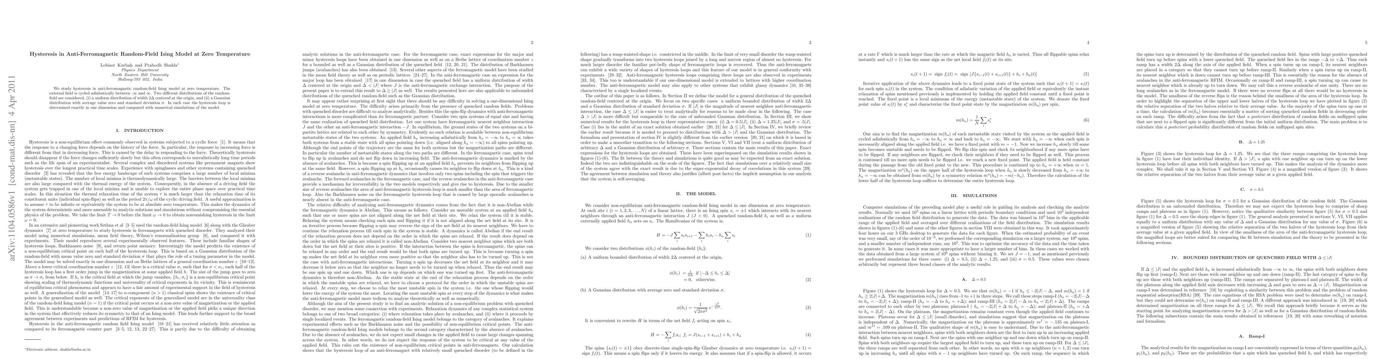This paper investigates hysteresis in the anti-ferromagnetic random-field Ising model at zero temperature, focusing on two random-field distributions. The exact hysteresis loop is determined in one dimension and compared with numerical simulations.