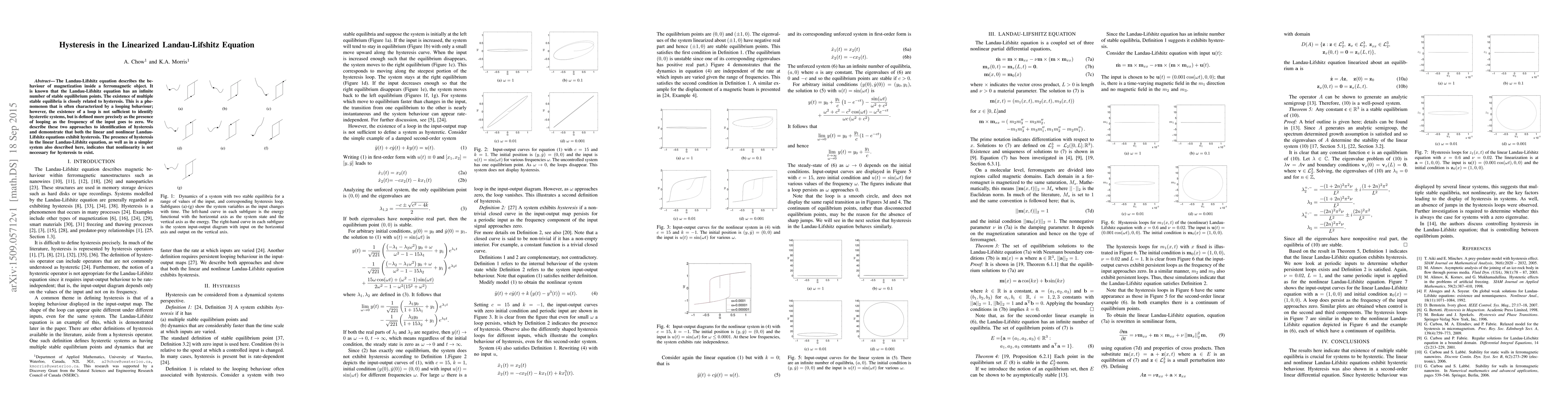 The Landau-Lifshitz equation describes the behaviour of magnetization inside a ferromagnetic object. It is known that the Landau-Lifshitz equation has an infinite number of stable equilibrium points. The existence of multiple stable equilibria is closely related to hysteresis. This is a phenomenon that is often characterized by a looping behaviour; however, the existence of a loop is not sufficient to identify hysteretic systems, but is defined more precisely as the presence of looping as the frequency of the input goes to zero. We describe these two approaches to identification of hysteresis and demonstrate that both the linear and nonlinear Landau-Lifshitz equations exhibit hysteresis. The presence of hysteresis in the linear Landau-Lifshitz equation, as well as in a simpler system also described here, indicates that nonlinearity is not necessary for hysteresis to exist.