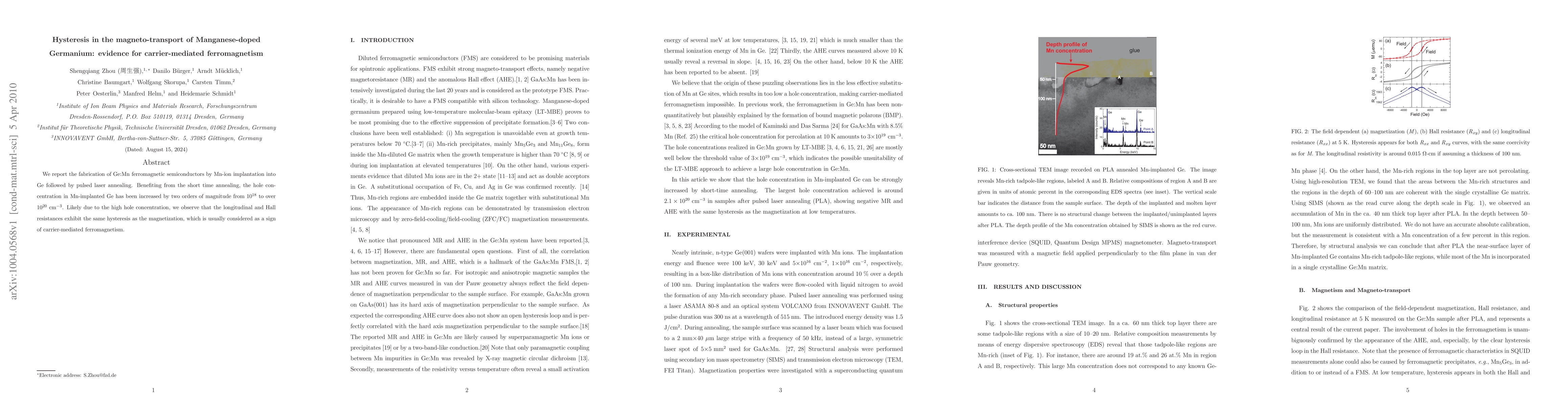 This paper reports the fabrication of Mn-doped Ge ferromagnetic semiconductors via Mn-ion implantation and pulsed laser annealing, achieving a significant increase in hole concentration. The observed hysteresis in both longitudinal and Hall resistances parallels the magnetization, indicating carrier-mediated ferromagnetism.