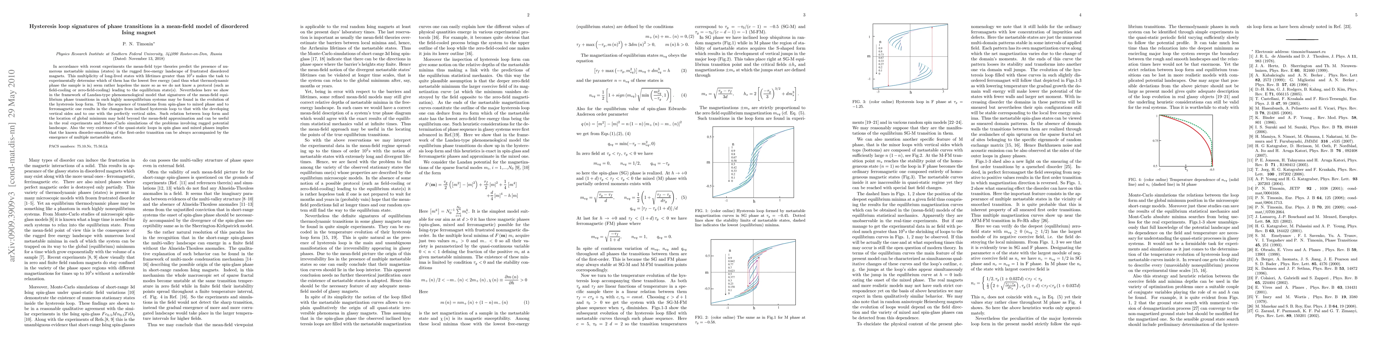 This paper demonstrates that the hysteresis loop signatures in a mean-field model of disordered Ising magnets can reveal phase transition sequences, transitioning from inclined to fully vertical loops as the system moves from spin-glass to mixed phases and finally to ferromagnetic states. These findings suggest a potential method for identifying global minima in highly nonequilibrium systems, useful for both experimental and simulation studies.