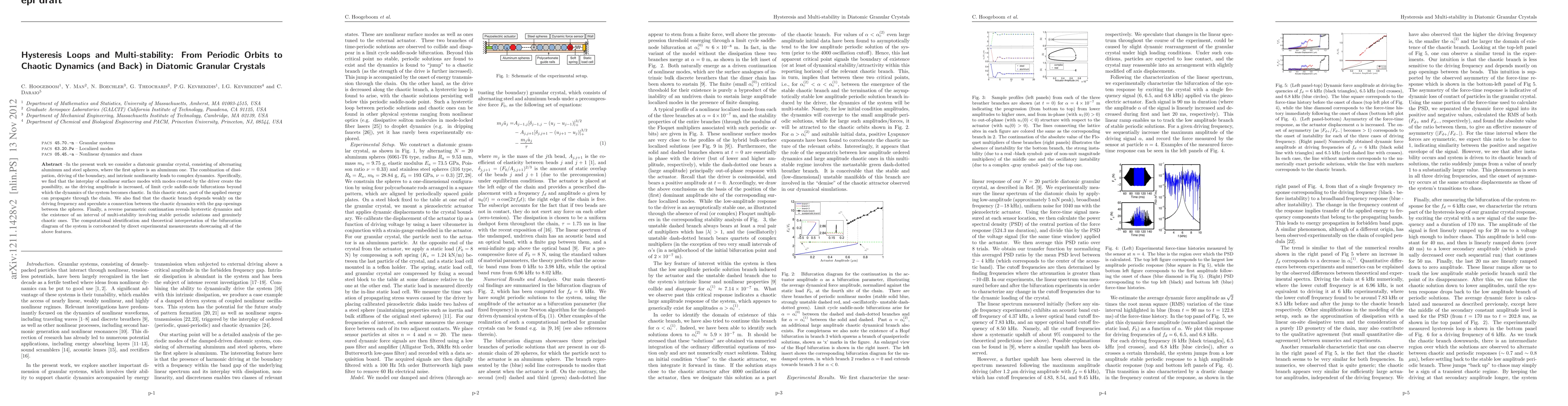 This paper investigates the chaotic dynamics of a diatomic granular crystal, revealing complex behaviors such as limit cycle bifurcations and multi-stability. The study finds that nonlinear interactions lead to chaotic states where energy propagates, and identifies hysteretic dynamics and multi-stability between periodic and chaotic solutions.