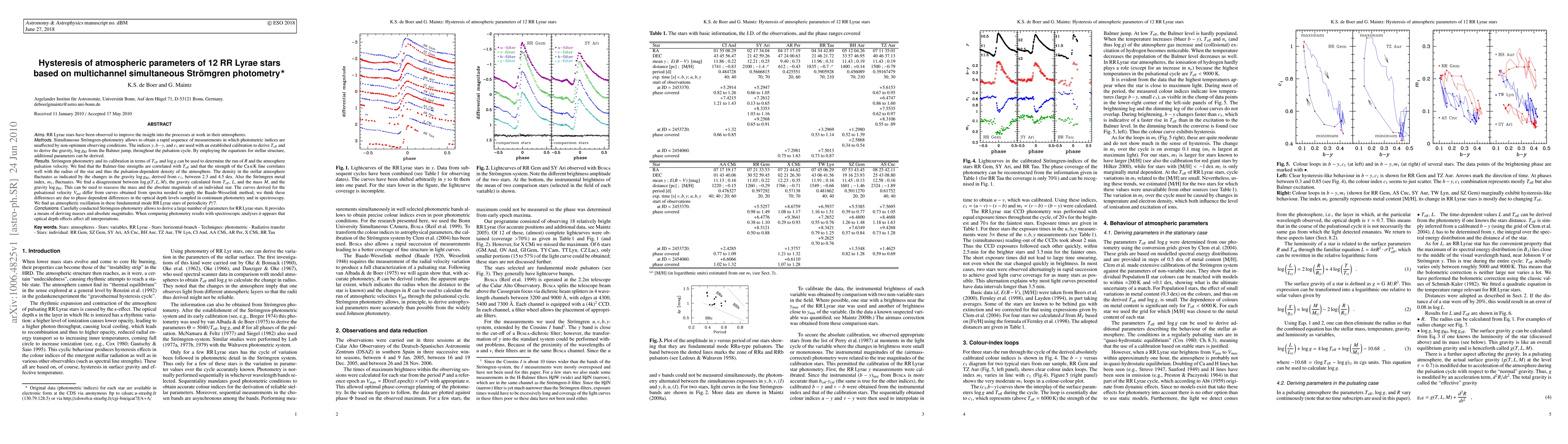 RR Lyrae stars have been observed to improve the insight into the processes at work in their atmospheres. Simultaneous Stroemgren-photometry allows to obtain a rapid sequence of measurements in which photometric indices are unaffected by non-optimum observing conditions. The indices y, b-y, and c_1 are used with an established calibration to derive T_eff and to derive the gravity, log g_BJ from the Balmer jump, throughout the pulsation cycle. By employing the equations for stellar structure, additional parameters can be derived. Stroemgren photometry and its calibration in terms of T_eff and log g can be used to determine the run of R and the atmosphere pulsation velocity. We find that the Balmer-line strengths are correlated with T_eff and that the strength of the Ca_ii K line correlates well with the radius of the star and thus the pulsation-dependent density of the atmosphere. The density in the stellar atmosphere fluctuates as indicated by the changes in the gravity log g_BJ, derived from c_1, between 2.3 and 4.5 dex. Also the Stroemgren metal index, m_1, fluctuates. We find a disagreement between log g(T,L,M), the gravity calculated from T_eff, L, and the mass M,and the gravity log g_BJ. This can be used to reassess the mass and the absolute magnitude of an individual star.The curves derived for the pulsational velocity V_pul differ from curves obtained from spectra needed to apply the Baade-Wesselink method; we think these differences are due to phase dependent differences in the optical depth levels sampled in continuum photometry and in spectroscopy. We find an atmospheric oscillation in these fundamental mode RR Lyrae stars of periodicity P/7.