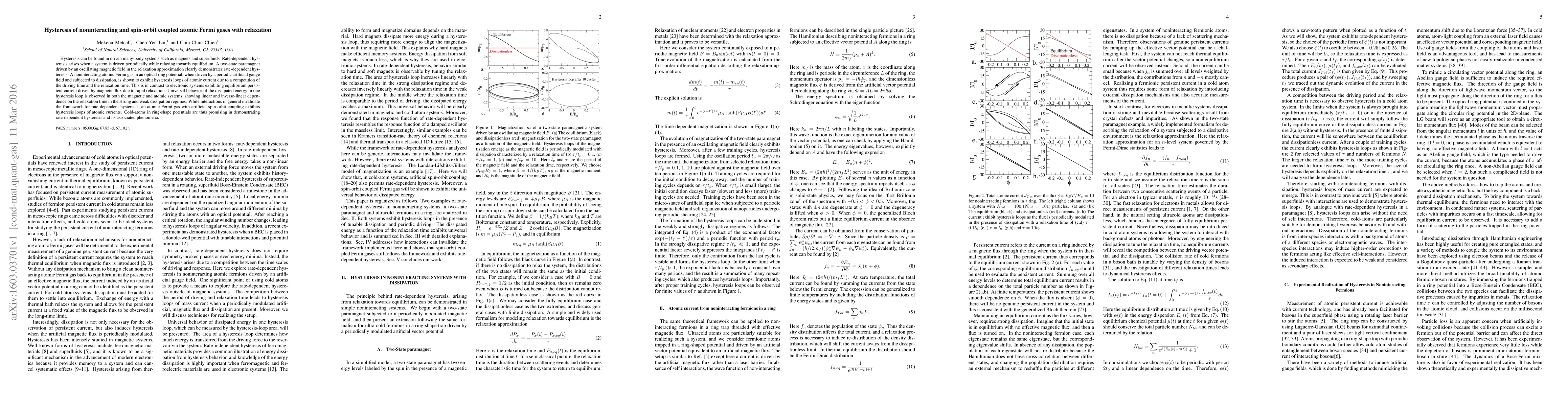 Hysteresis can be found in driven many-body systems such as magnets and superfluids. Rate-dependent hysteresis arises when a system is driven periodically while relaxing towards equilibrium. A two-state paramagnet driven by an oscillating magnetic field in the relaxation approximation clearly demonstrates rate-dependent hysteresis. A noninteracting atomic Fermi gas in an optical ring potential, when driven by a periodic artificial gauge field and subjected to dissipation, is shown to exhibit hysteresis loops of atomic current due to a competition of the driving time and the relaxation time. This is in contrast to electronic systems exhibiting equilibrium persistent current driven by magnetic flux due to rapid relaxation. Universal behavior of the dissipated energy in one hysteresis loop is observed in both the magnetic and atomic systems, showing linear and inverse-linear dependence on the relaxation time in the strong and weak dissipation regimes. While interactions in general invalidate the framework for rate-dependent hysteresis, an atomic Fermi gas with artificial spin-orbit coupling exhibits hysteresis loops of atomic currents. Cold-atoms in ring-shape potentials are thus promising in demonstrating rate-dependent hysteresis and its associated phenomena.