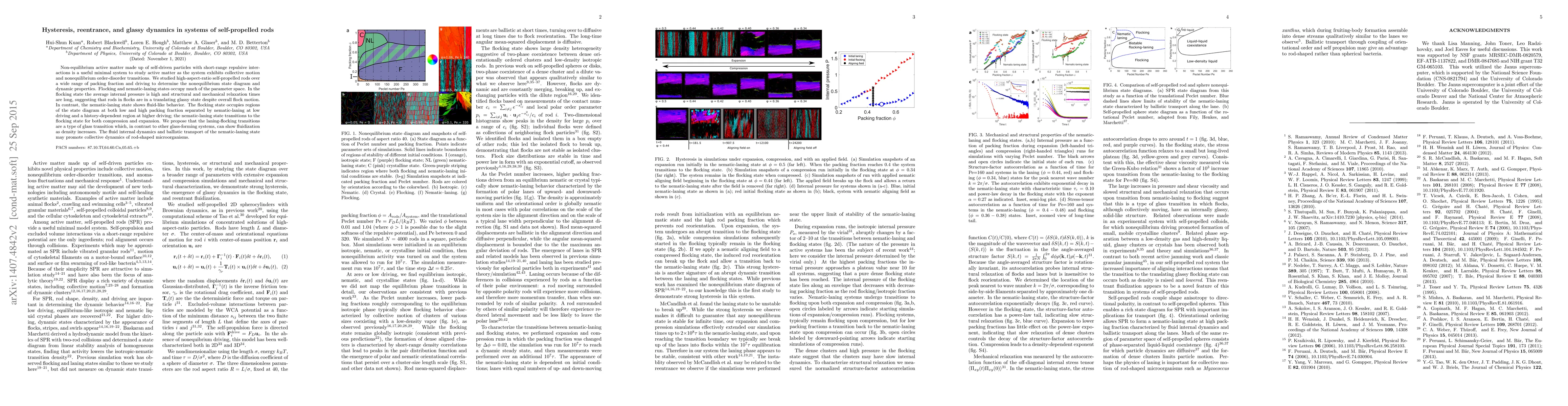 This paper investigates the dynamics of self-propelled rods, revealing a nonequilibrium state diagram with flocking and nematic-laning states. The flocking state exhibits glassy dynamics despite flock motion, while the nematic-laning state shows fluid-like behavior, suggesting a unique glass transition with fluidization at higher densities.