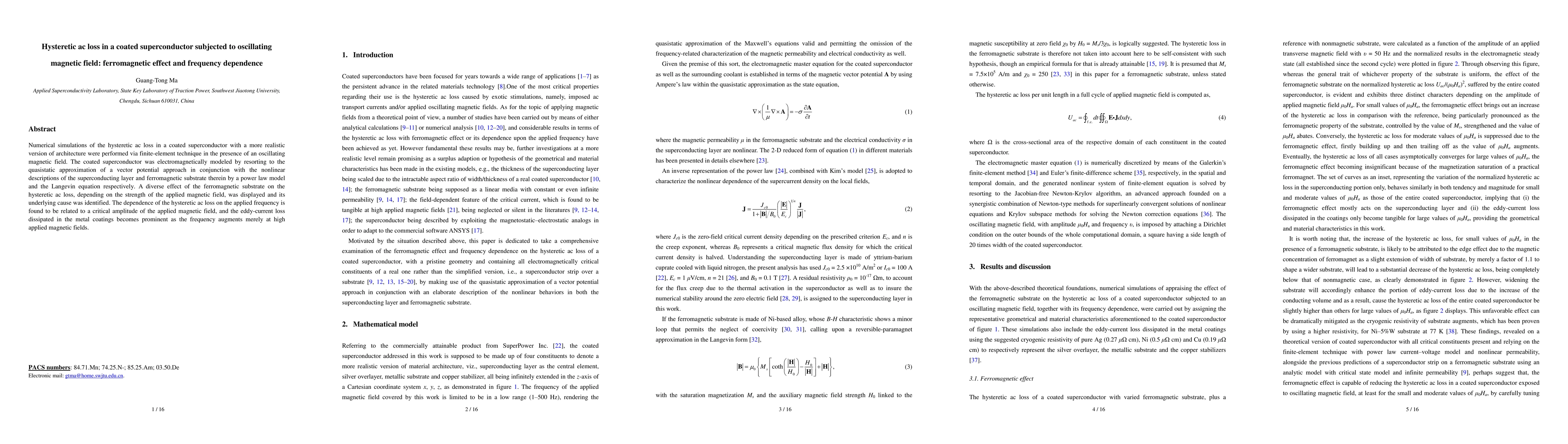 This paper investigates the hysteretic ac loss in coated superconductors under oscillating magnetic fields using finite-element simulations. It reveals the ferromagnetic substrate's diverse effect on ac loss, linked to the applied magnetic field strength, and shows that frequency dependence is tied to a critical magnetic field amplitude, with eddy-current losses in metal coatings becoming significant at high frequencies.