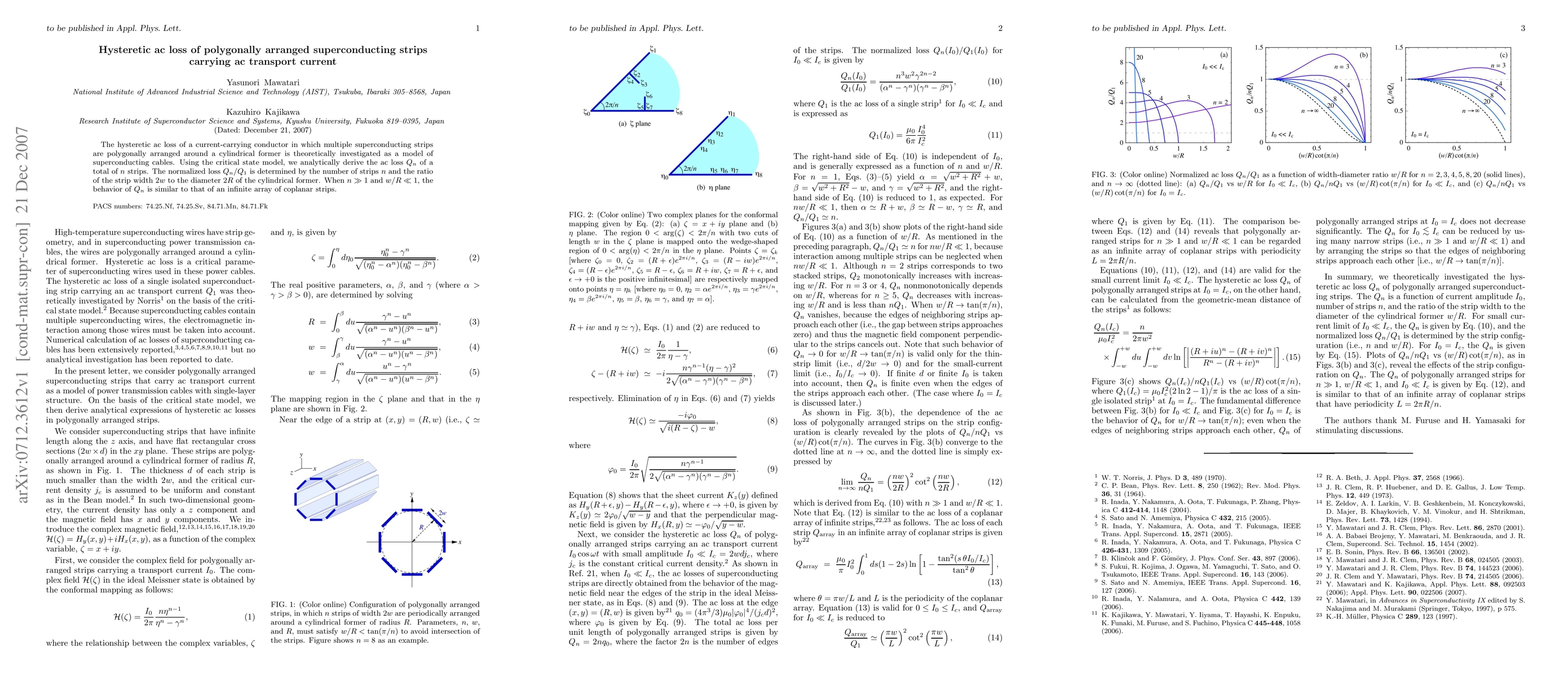 This paper investigates the hysteretic ac loss in superconducting cables modeled by polygonally arranged superconducting strips around a cylindrical former. The critical state model is used to derive the ac loss $Q_n$ for $n$ strips, showing that normalized loss $Q_n/Q_1$ depends on the number of strips and the ratio of strip width to the cylinder diameter.