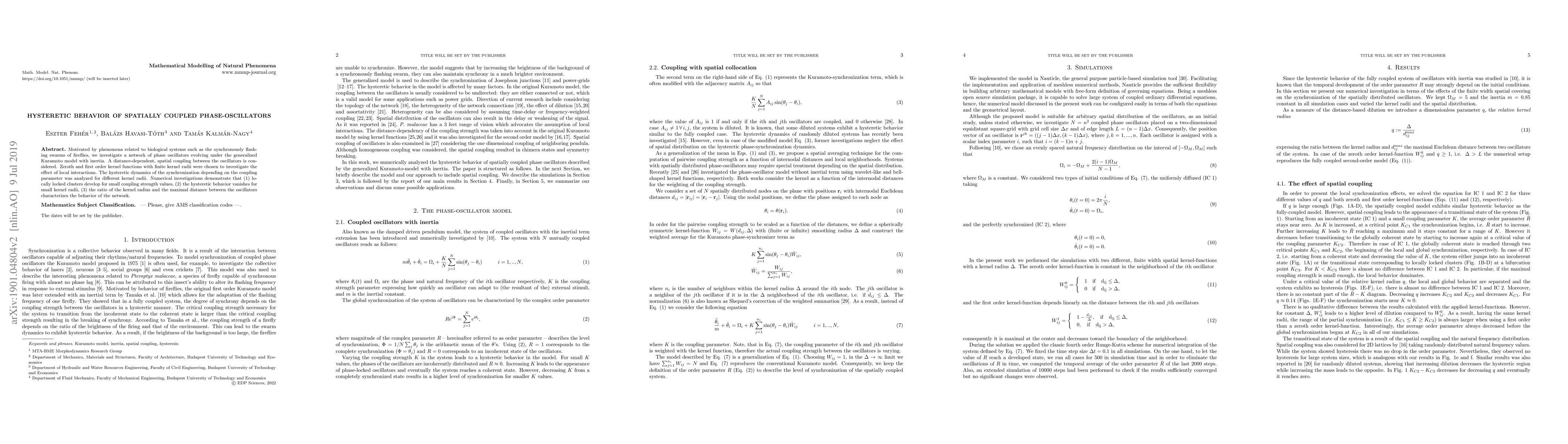 Motivated by phenomena related to biological systems such as the synchronously flashing swarms of fireflies, we investigate a network of phase oscillators evolving under the generalized Kuramoto model with inertia. A distance-dependent, spatial coupling between the oscillators is considered. Zeroth and first order kernel functions with finite kernel radii were chosen to investigate the effect of local interactions. The hysteretic dynamics of the synchronization depending on the coupling parameter was analyzed for different kernel radii. Numerical investigations demonstrate that (1) locally locked clusters develop for small coupling strength values, (2) the hysteretic behavior vanishes for small kernel radii, (3) the ratio of the kernel radius and the maximal distance between the oscillators characterizes the behavior of the network.