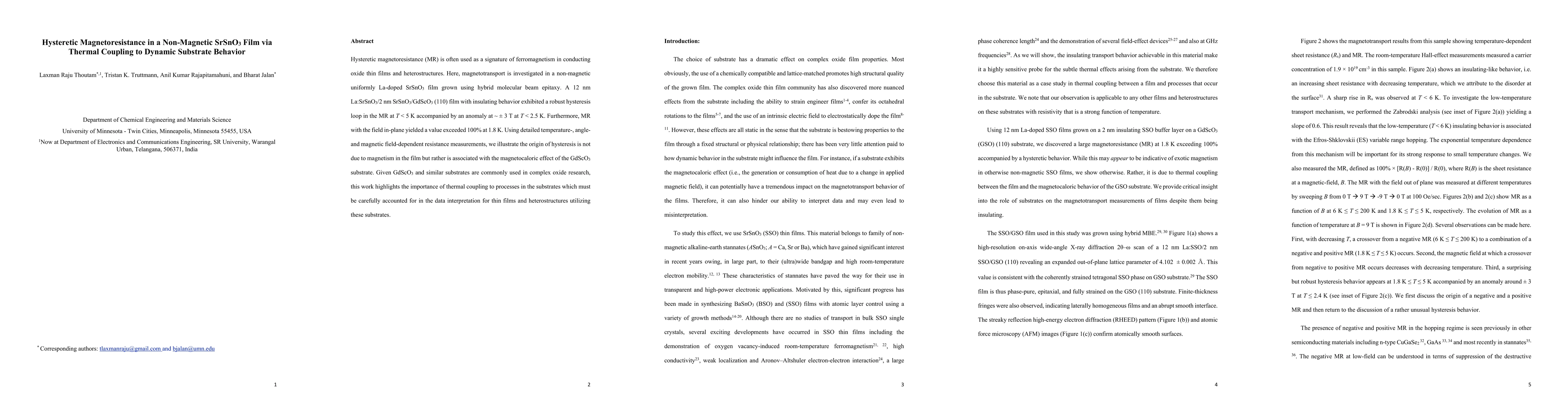 Hysteretic magnetoresistance (MR) is often used as a signature of ferromagnetism in conducting oxide thin films and heterostructures. Here, magnetotransport is investigated in a non-magnetic uniformly La-doped SrSnO3 film grown using hybrid molecular beam epitaxy. A 12 nm La:SrSnO3/2 nm SrSnO3/GdScO3 (110) film with insulating behavior exhibited a robust hysteresis loop in the MR at T < 5 K accompanied by an anomaly at ~ +/- 3 T at T < 2.5 K. Furthermore, MR with the field in-plane yielded a value exceeded 100% at 1.8 K. Using detailed temperature-, angle- and magnetic field-dependent resistance measurements, we illustrate the origin of hysteresis is not due to magnetism in the film but rather is associated with the magnetocaloric effect of the GdScO3 substrate. Given GdScO3 and similar substrates are commonly used in complex oxide research, this work highlights the importance of thermal coupling to processes in the substrates which must be carefully accounted for in the data interpretation for thin films and heterostructures utilizing these substrates.
