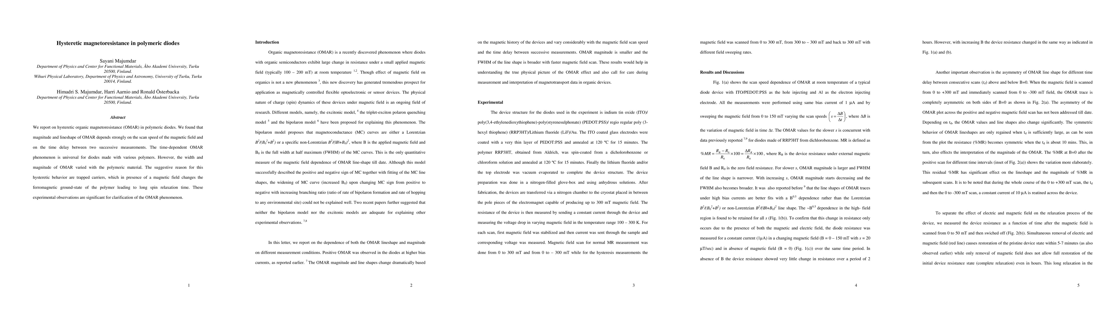 We report on hysteretic organic magnetoresistance (OMAR) in polymeric diodes. We found that magnitude and lineshape of OMAR depends strongly on the scan speed of the magnetic field and on the time delay between two successive measurements. The time-dependent OMAR phenomenon is universal for diodes made with various polymers. However, the width and magnitude of OMAR varied with the polymeric material. The suggestive reason for this hysteretic behavior are trapped carriers, which in presence of a magnetic field changes the ferromagnetic ground-state of the polymer leading to long spin relaxation time. These experimental observations are significant for clarification of the OMAR phenomenon.