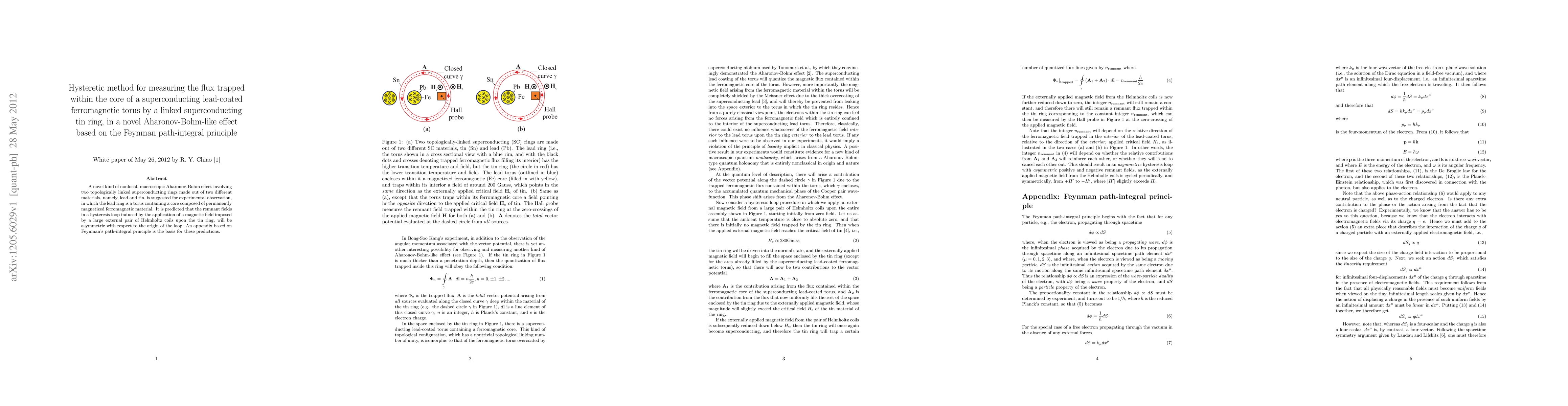 A novel kind of nonlocal, macroscopic Aharonov-Bohm effect involving two topologically linked superconducting rings made out of two different materials, namely, lead and tin, is suggested for experimental observation, in which the lead ring is a torus containing a core composed of permanently magnetized ferromagnetic material. It is predicted that the remnant fields in a hysteresis loop induced by the application of a magnetic field imposed by a large external pair of Helmholtz coils upon the tin ring, will be asymmetric with respect to the origin of the loop. An appendix based on Feynman's path-integral principle is the basis for these predictions.