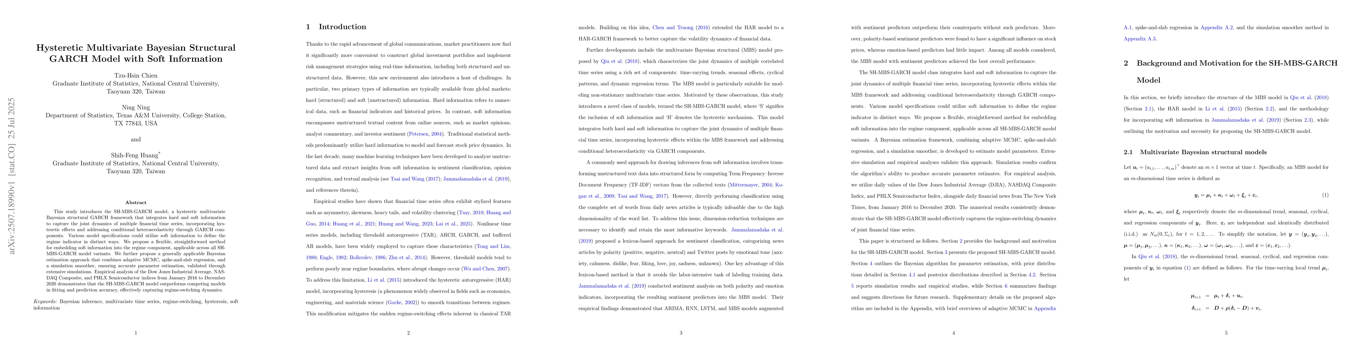 The paper introduces the SH-MBS-GARCH model, a hysteretic multivariate Bayesian structural GARCH framework that integrates hard and soft information to capture joint dynamics of multiple financial time series, using GARCH components to address conditional heteroscedasticity.