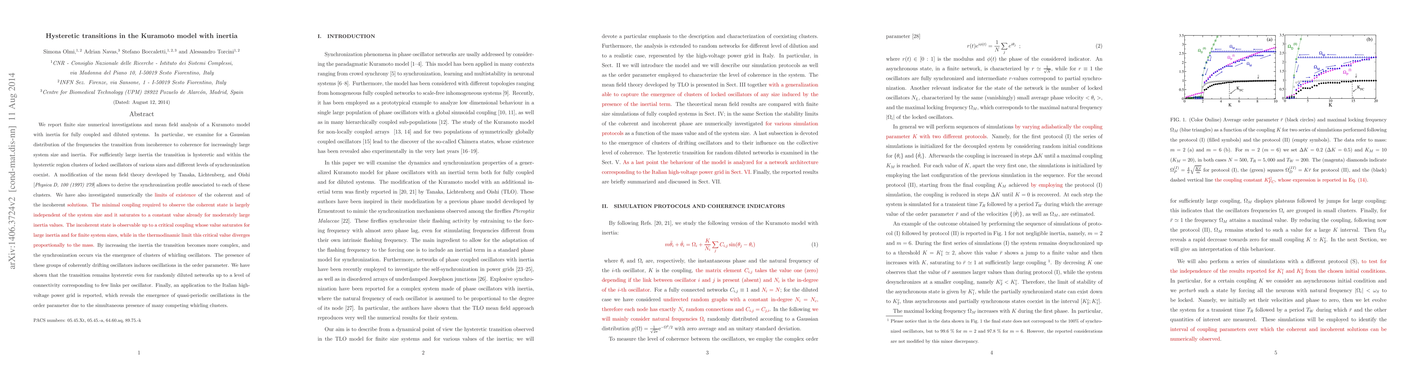 We report finite size numerical investigations and mean field analysis of a Kuramoto model with inertia for fully coupled and diluted systems. In particular, we examine for a Gaussian distribution of the frequencies the transition from incoherence to coherence for increasingly large system size and inertia. For sufficiently large inertia the transition is hysteretic and within the hysteretic region clusters of locked oscillators of various sizes and different levels of synchronization coexist. A modification of the mean field theory developed by Tanaka, Lichtenberg, and Oishi [Physica D, 100 (1997) 279] allows to derive the synchronization profile associated to each of these clusters. We have also investigated numerically the limits of existence of the coherent and of the incoherent solutions. The minimal coupling required to observe the coherent state is largely independent of the system size and it saturates to a constant value already for moderately large inertia values. The incoherent state is observable up to a critical coupling whose value saturates for large inertia and for finite system sizes, while in the thermodinamic limit this critical value diverges proportionally to the mass. By increasing the inertia the transition becomes more complex, and the synchronization occurs via the emergence of clusters of whirling oscillators. The presence of these groups of coherently drifting oscillators induces oscillations in the order parameter. We have shown that the transition remains hysteretic even for randomly diluted networks up to a level of connectivity corresponding to few links per oscillator. Finally, an application to the Italian high-voltage power grid is reported, which reveals the emergence of quasi-periodic oscillations in the order parameter due to the simultaneous presence of many competing whirling clusters.