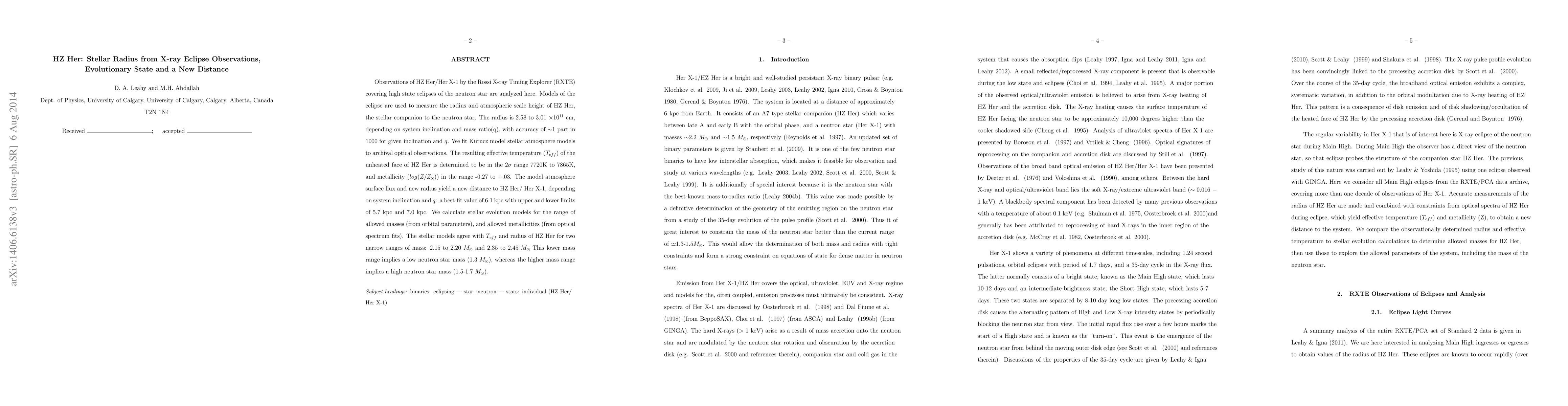Observations of HZ Her/Her X-1 by the Rossi X-ray Timing Explorer (RXTE) covering high state eclipses of the neutron star are analyzed here. Models of the eclipse are used to measure the radius and atmospheric scale height of HZ Her, the stellar companion to the neutron star. The radius is 2.58 to 3.01 $\times10^{11}$ cm, depending on system inclination and mass ratio(q), with accuracy of $\sim$1 part in 1000 for given inclination and $q$. We fit Kurucz model stellar atmosphere models to archival optical observations. The resulting effective temperature ($T_{eff}$) of the unheated face of HZ Her is determined to be in the 2$\sigma$ range 7720K to 7865K, and metallicity ($log(Z/Z_{\odot})$) in the range -0.27 to +.03. The model atmosphere surface flux and new radius yield a new distance to HZ Her/ Her X-1, depending on system inclination and $q$: a best-fit value of 6.1 kpc with upper and lower limits of 5.7 kpc and 7.0 kpc. We calculate stellar evolution models for the range of allowed masses (from orbital parameters), and allowed metallicities (from optical spectrum fits). The stellar models agree with $T_{eff}$ and radius of HZ Her for two narrow ranges of mass: 2.15 to 2.20 $M_{\odot}$ and 2.35 to 2.45 $M_{\odot}$ This lower mass range implies a low neutron star mass (1.3 $M_{\odot}$), whereas the higher mass range implies a high neutron star mass (1.5-1.7 $M_{\odot}$).