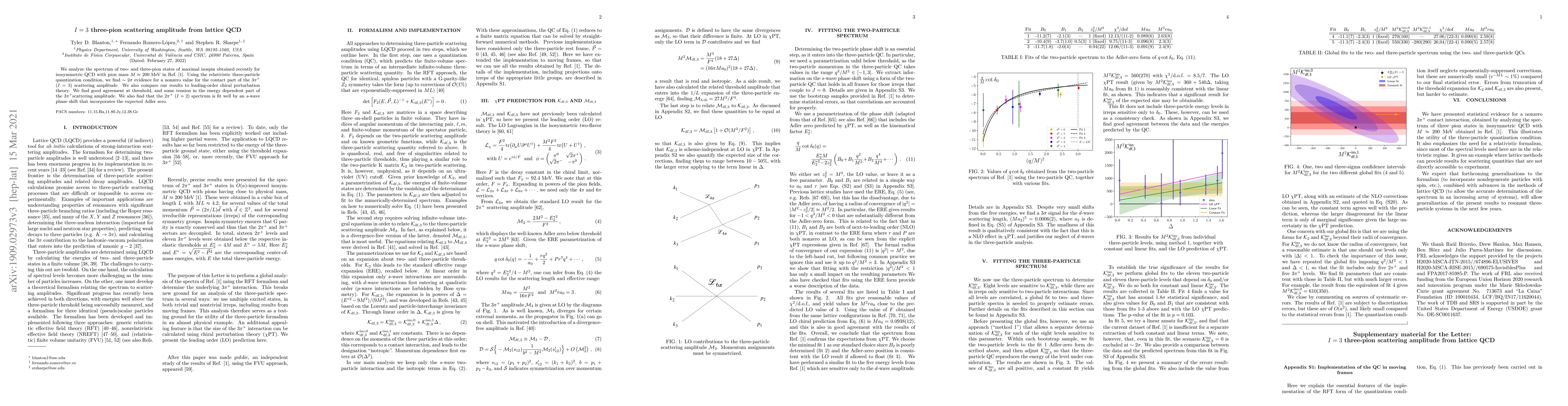 We analyze the spectrum of two- and three-pion states of maximal isospin obtained recently for isosymmetric QCD with pion mass $M\approx 200\;$MeV in Ref. [1]. Using the relativistic three-particle quantization condition, we find $\sim 2 \sigma$ evidence for a nonzero value for the contact part of the three-$\pi^+$ ($I=3$) scattering amplitude. We also compare our results to leading-order chiral perturbation theory. We find good agreement at threshold, and some tension in the energy dependent part of the three-$\pi^+$scattering amplitude. We also find that the two-$\pi^+$ ($I=2$) spectrum is fit well by an $s$-wave phase shift that incorporates the expected Adler zero.