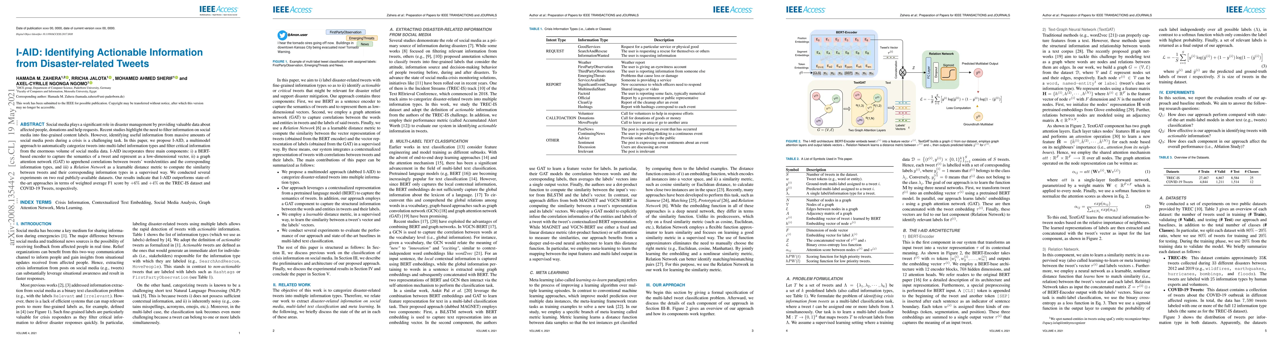 This paper proposes I-AID, a multimodel approach to categorize disaster-related tweets into fine-grained information types, using a BERT-based encoder, graph attention network, and Relation Network. Experiments show I-AID outperforms existing methods by +6% and +4% in F1 score on TREC-IS and COVID-19 datasets.