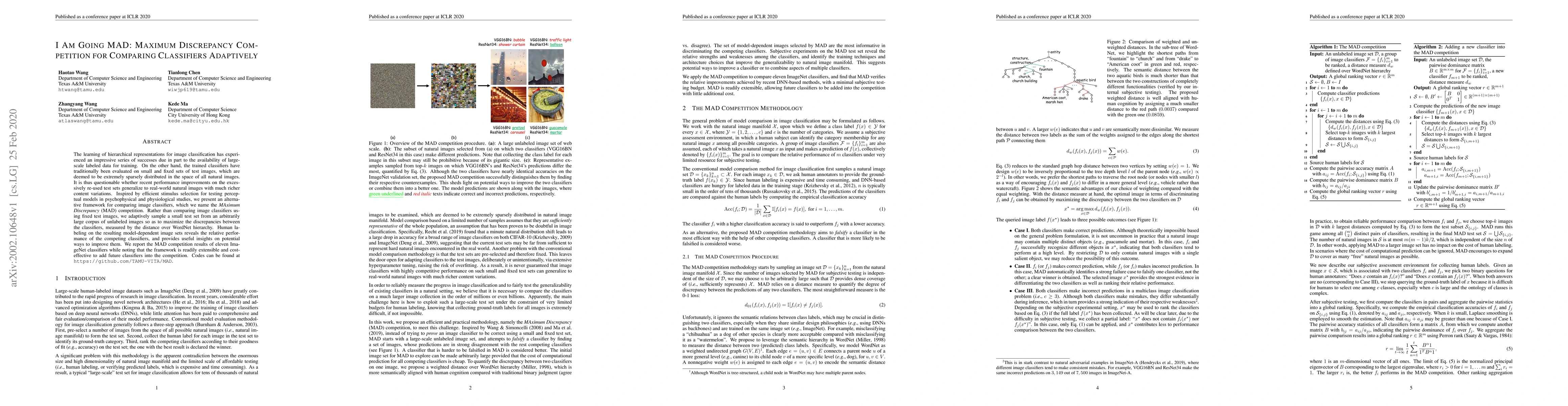 A new framework called Maximum Discrepancy (MAD) competition compares image classifiers using adaptive sampling of unlabeled images to maximize discrepancies between models, revealing performance and potential improvements.