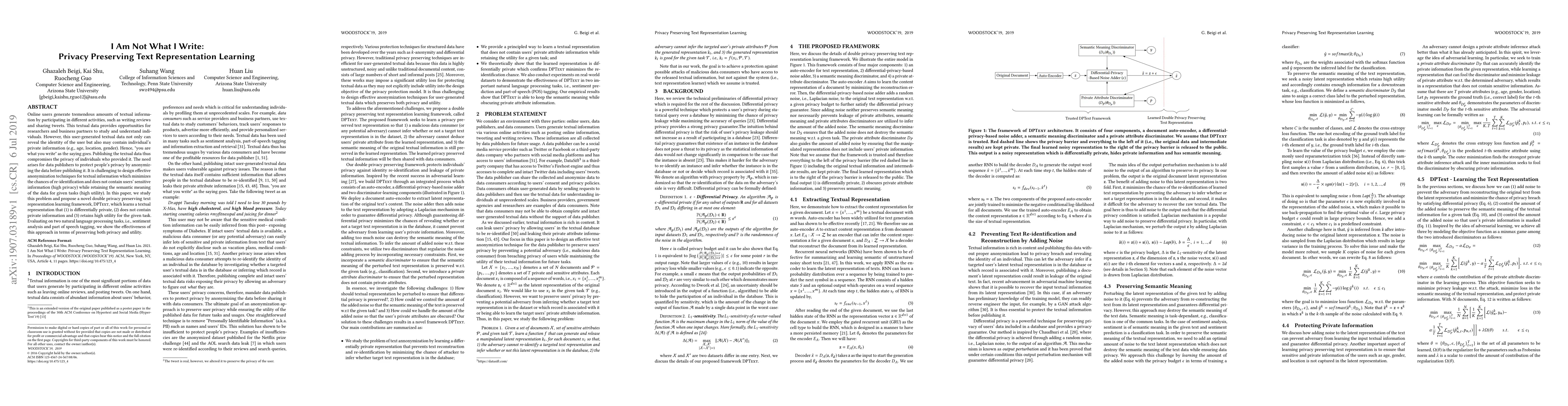 This paper proposes DPText, a novel framework for privacy-preserving text representation learning that aims to anonymize textual data while maintaining its utility for tasks like sentiment analysis and part-of-speech tagging. DPText achieves differential privacy, excludes private information, and retains semantic meaning.