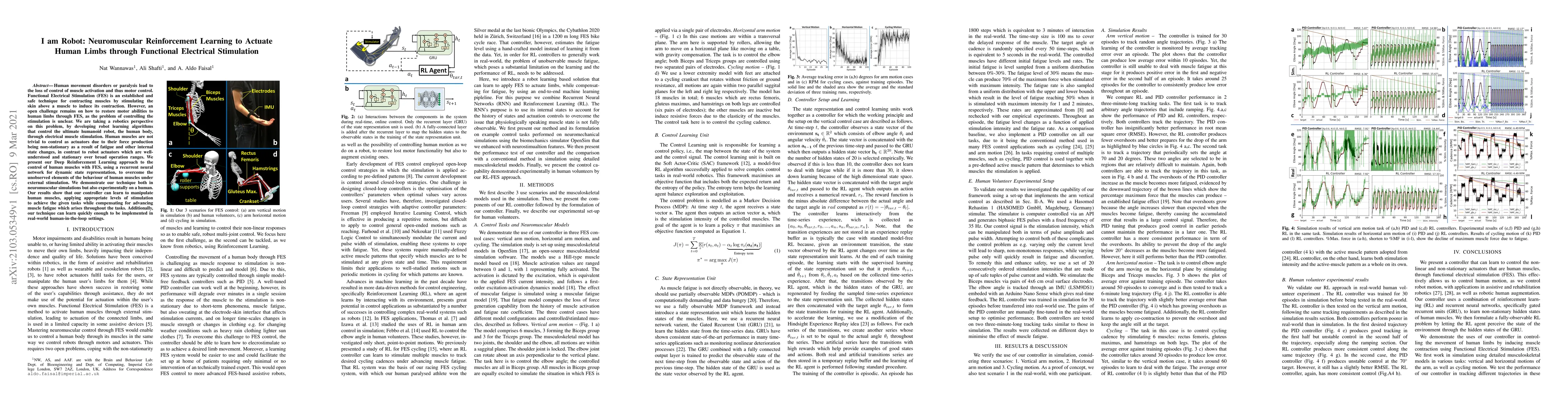 Human movement disorders or paralysis lead to the loss of control of muscle activation and thus motor control. Functional Electrical Stimulation (FES) is an established and safe technique for contracting muscles by stimulating the skin above a muscle to induce its contraction. However, an open challenge remains on how to restore motor abilities to human limbs through FES, as the problem of controlling the stimulation is unclear. We are taking a robotics perspective on this problem, by developing robot learning algorithms that control the ultimate humanoid robot, the human body, through electrical muscle stimulation. Human muscles are not trivial to control as actuators due to their force production being non-stationary as a result of fatigue and other internal state changes, in contrast to robot actuators which are well-understood and stationary over broad operation ranges. We present our Deep Reinforcement Learning approach to the control of human muscles with FES, using a recurrent neural network for dynamic state representation, to overcome the unobserved elements of the behaviour of human muscles under external stimulation. We demonstrate our technique both in neuromuscular simulations but also experimentally on a human. Our results show that our controller can learn to manipulate human muscles, applying appropriate levels of stimulation to achieve the given tasks while compensating for advancing muscle fatigue which arises throughout the tasks. Additionally, our technique can learn quickly enough to be implemented in real-world human-in-the-loop settings.