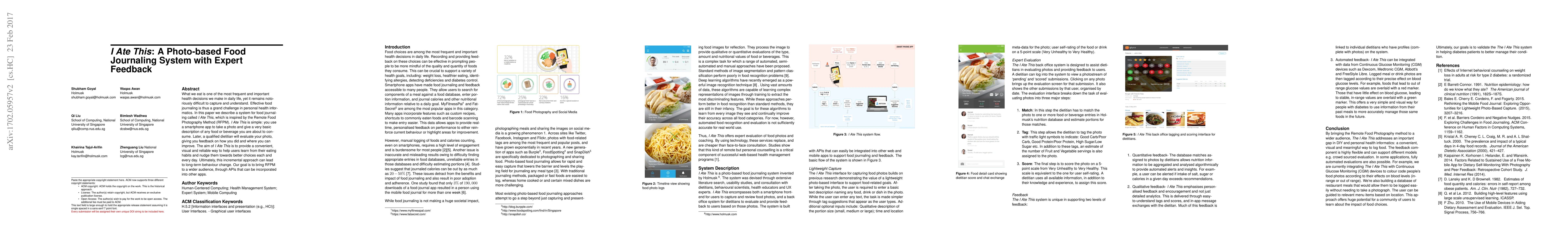 The paper introduces "I Ate This," a smartphone app for photo-based food journaling, where users capture their meals with a photo and brief description. Expert dietitians provide feedback to help users improve their eating habits, aiming for long-term behavior change through visual and reliable dietary insights.