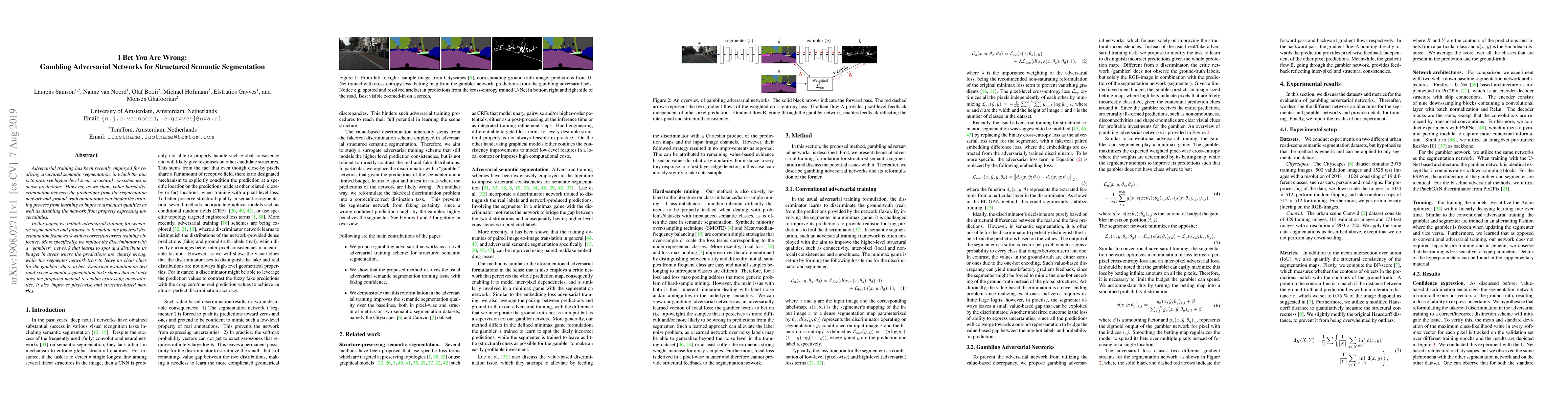 Adversarial training has been recently employed for realizing structured semantic segmentation, in which the aim is to preserve higher-level scene structural consistencies in dense predictions. However, as we show, value-based discrimination between the predictions from the segmentation network and ground-truth annotations can hinder the training process from learning to improve structural qualities as well as disabling the network from properly expressing uncertainties. In this paper, we rethink adversarial training for semantic segmentation and propose to formulate the fake/real discrimination framework with a correct/incorrect training objective. More specifically, we replace the discriminator with a "gambler" network that learns to spot and distribute its budget in areas where the predictions are clearly wrong, while the segmenter network tries to leave no clear clues for the gambler where to bet. Empirical evaluation on two road-scene semantic segmentation tasks shows that not only does the proposed method re-enable expressing uncertainties, it also improves pixel-wise and structure-based metrics.