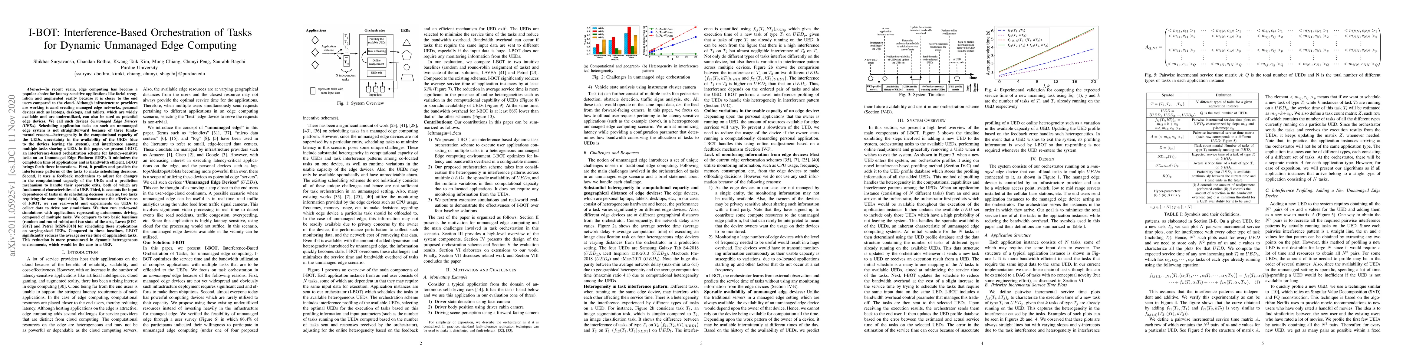 I-BOT is an interference-based orchestration scheme for scheduling latency-sensitive tasks on unmanaged edge devices, optimizing completion time and bandwidth efficiency by profiling interference patterns, adjusting for dynamic device availability, and considering task input dependencies. Simulation results show significant reductions in average service time compared to baselines and state-of-the-art methods.