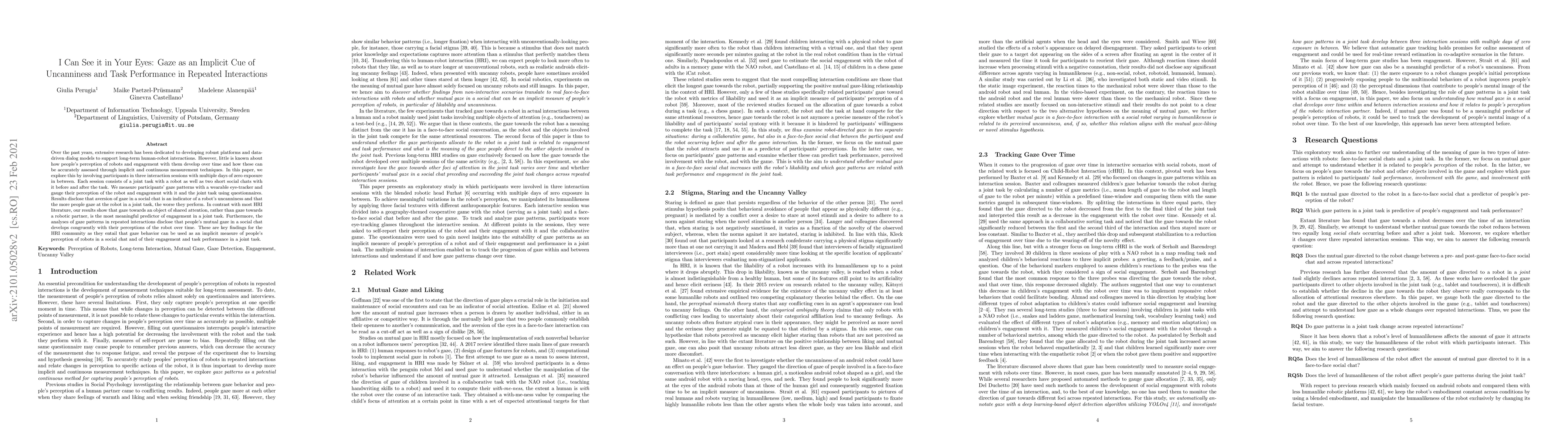 This paper investigates how gaze patterns serve as implicit cues for uncanniness perception and task performance in repeated human-robot interactions. It finds that reduced gaze in social chats correlates with higher uncanniness, while more gaze towards shared objects, rather than the robot, predicts better task performance.