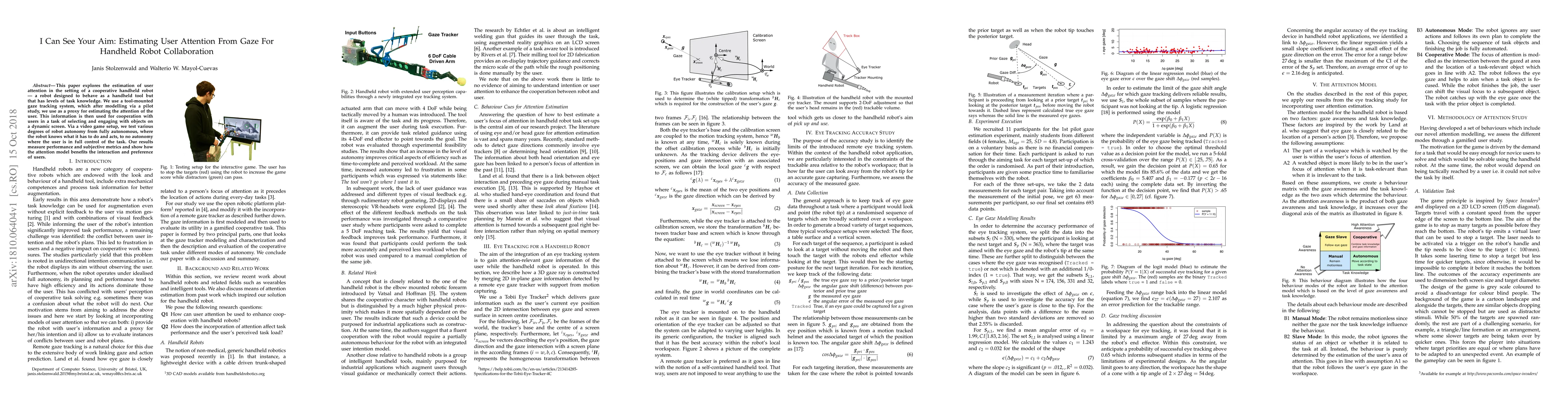 This paper explores the estimation of user attention in the setting of a cooperative handheld robot: a robot designed to behave as a handheld tool but that has levels of task knowledge. We use a tool-mounted gaze tracking system, which, after modelling via a pilot study, we use as a proxy for estimating the attention of the user. This information is then used for cooperation with users in a task of selecting and engaging with objects on a dynamic screen. Via a video game setup, we test various degrees of robot autonomy from fully autonomous, where the robot knows what it has to do and acts, to no autonomy where the user is in full control of the task. Our results measure performance and subjective metrics and show how the attention model benefits the interaction and preference of users.