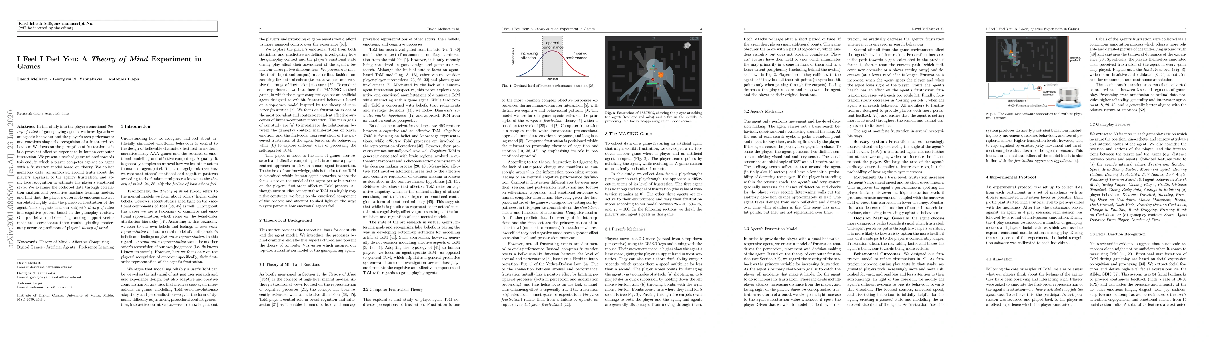 In this study into the player's emotional theory of mind of gameplaying agents, we investigate how an agent's behaviour and the player's own performance and emotions shape the recognition of a frustrated behaviour. We focus on the perception of frustration as it is a prevalent affective experience in human-computer interaction. We present a testbed game tailored towards this end, in which a player competes against an agent with a frustration model based on theory. We collect gameplay data, an annotated ground truth about the player's appraisal of the agent's frustration, and apply face recognition to estimate the player's emotional state. We examine the collected data through correlation analysis and predictive machine learning models, and find that the player's observable emotions are not correlated highly with the perceived frustration of the agent. This suggests that our subject's theory of mind is a cognitive process based on the gameplay context. Our predictive models---using ranking support vector machines---corroborate these results, yielding moderately accurate predictors of players' theory of mind.
