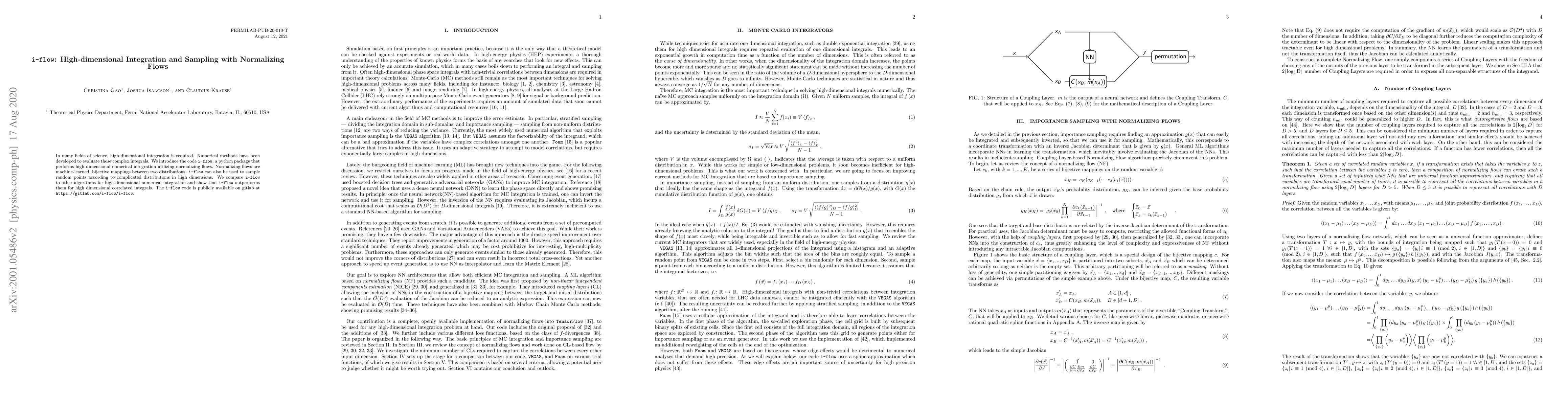 i-flow is a Python package for high-dimensional numerical integration and sampling using normalizing flows, demonstrating superior performance for correlated integrals compared to other methods. The code is freely available on GitLab.