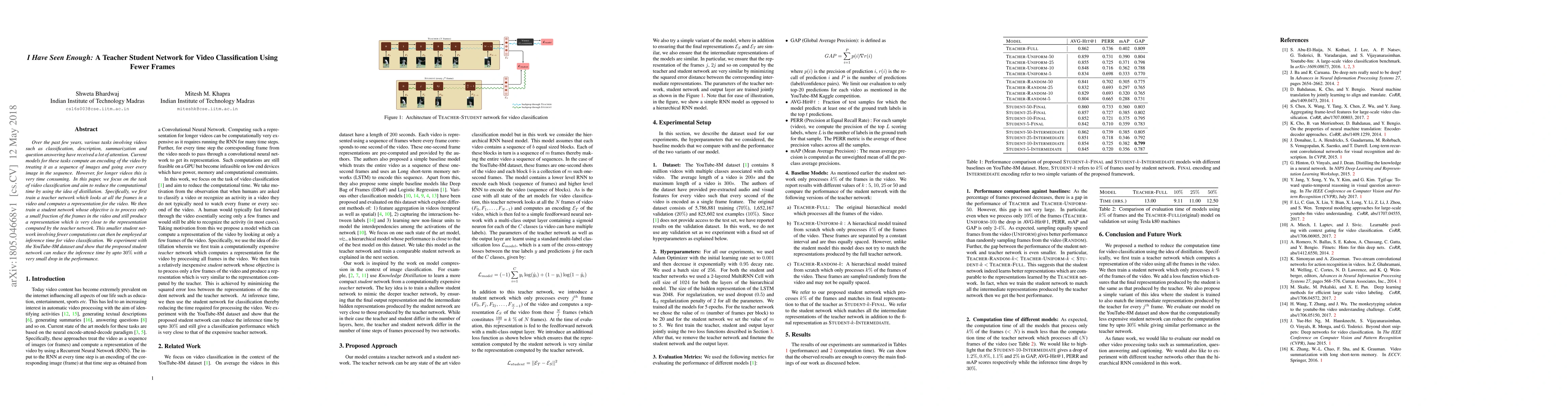 This paper proposes a teacher-student network approach to reduce computational time for video classification by training a student network to process fewer frames while maintaining performance, achieving up to 30% reduction in inference time with minimal loss in accuracy using the YouTube-8M dataset.
