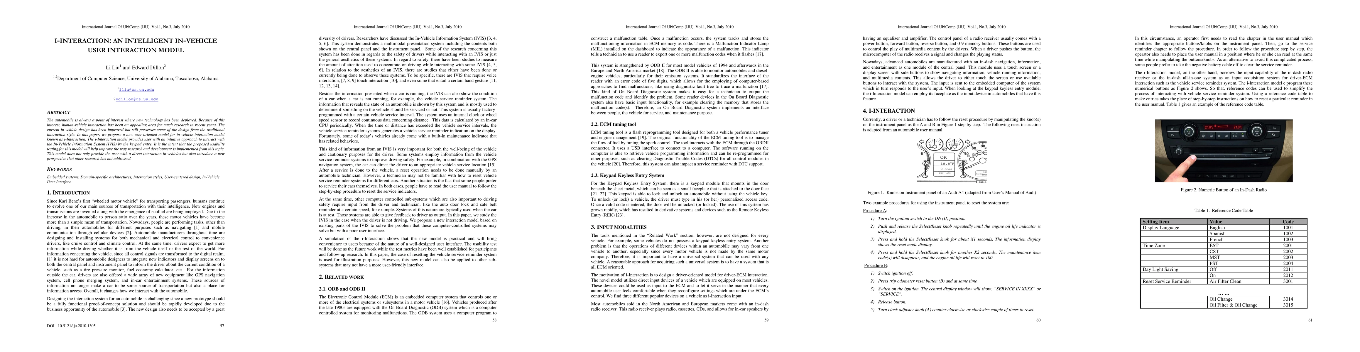 The automobile is always a point of interest where new technology has been deployed. Because of this interest, human-vehicle interaction has been an appealing area for much research in recent years. The current in-vehicle design has been improved but still possesses some of the design from the traditional interaction style. In this paper, we propose a new user-oriented model for in-vehicle interaction model known as i-Interaction. The i-Interaction model provides user with an intuitive approach to interact with the In-Vehicle Information System (IVIS) by the keypad entry. It is the intent that the proposed usability testing for this model will help improve the way research and development is implemented from this topic. This model does not only provide the user with a direct interaction in vehicles but also introduce a new prospective that other research has not addressed.