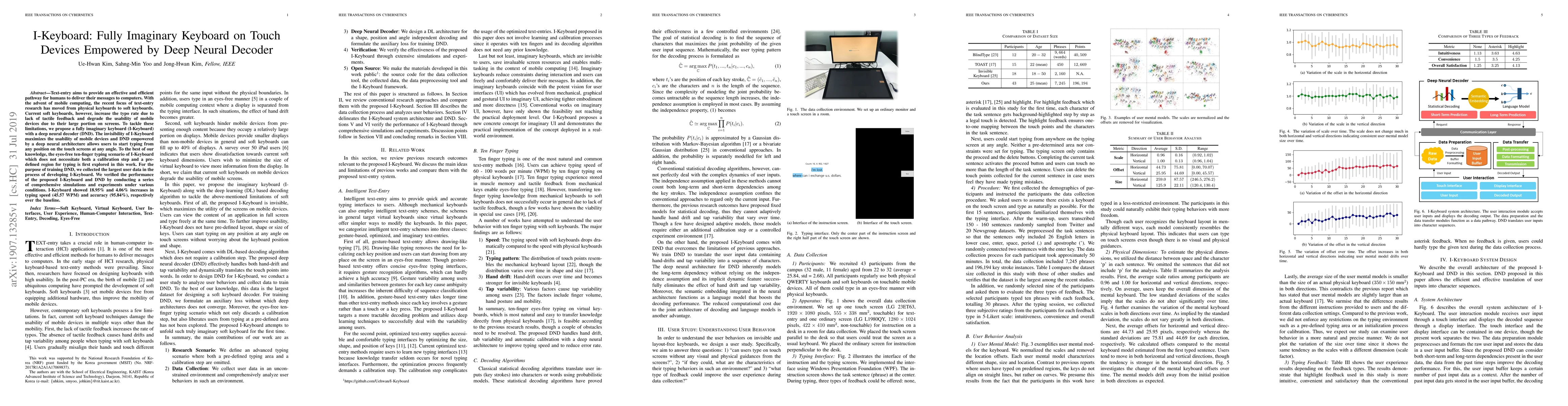 The I-Keyboard proposes a fully imaginary keyboard on touch devices empowered by a deep neural decoder, aiming to enhance text-entry efficiency and usability by eliminating the need for tactile feedback and screen space constraints. Experiments show a significant improvement in typing speed and accuracy compared to traditional soft keyboards.