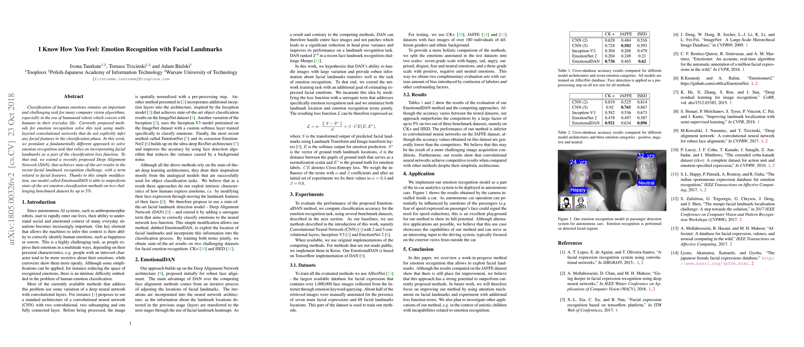 The paper proposes EmotionalDAN, an extension of Deep Alignment Network (DAN) that incorporates facial landmarks into the classification loss function for emotion recognition. This method is trained on AffectNet, a large-scale facial expression database, and tested on CK+, JAFFE, and ISED datasets.
