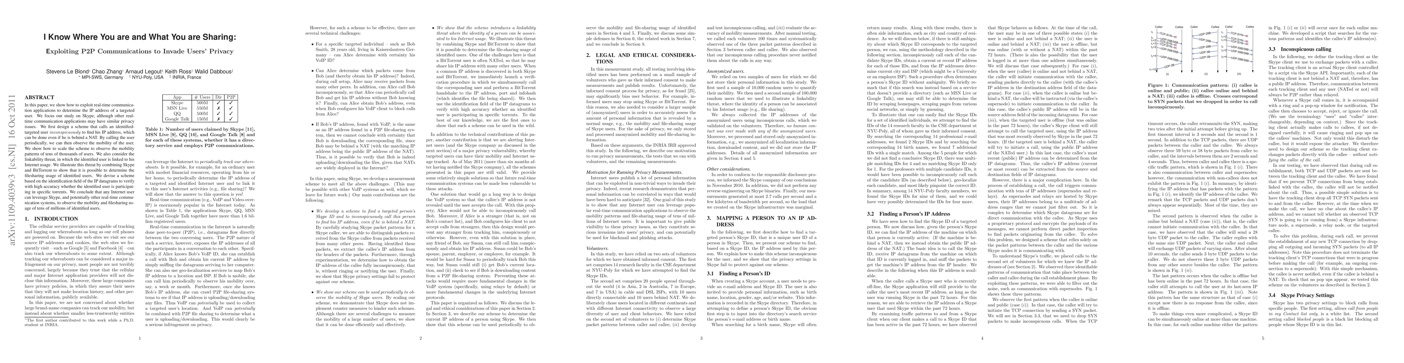 In this paper, we show how to exploit real-time communication applications to determine the IP address of a targeted user. We focus our study on Skype, although other real-time communication applications may have similar privacy issues. We first design a scheme that calls an identified targeted user inconspicuously to find his IP address, which can be done even if he is behind a NAT. By calling the user periodically, we can then observe the mobility of the user. We show how to scale the scheme to observe the mobility patterns of tens of thousands of users. We also consider the linkability threat, in which the identified user is linked to his Internet usage. We illustrate this threat by combining Skype and BitTorrent to show that it is possible to determine the file-sharing usage of identified users. We devise a scheme based on the identification field of the IP datagrams to verify with high accuracy whether the identified user is participating in specific torrents. We conclude that any Internet user can leverage Skype, and potentially other real-time communication systems, to observe the mobility and file-sharing usage of tens of millions of identified users.