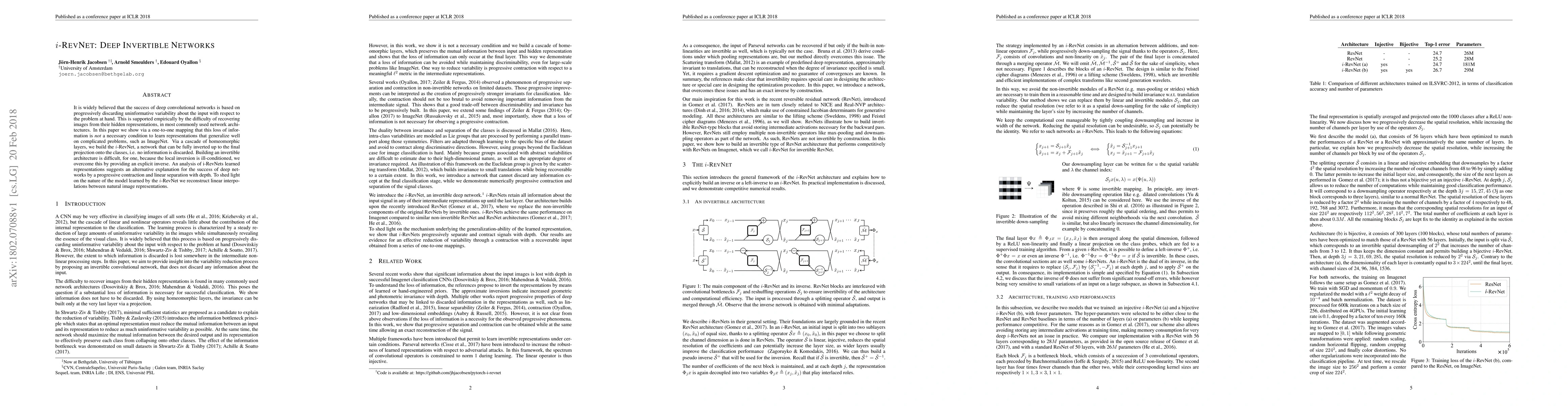 It is widely believed that the success of deep convolutional networks is based on progressively discarding uninformative variability about the input with respect to the problem at hand. This is supported empirically by the difficulty of recovering images from their hidden representations, in most commonly used network architectures. In this paper we show via a one-to-one mapping that this loss of information is not a necessary condition to learn representations that generalize well on complicated problems, such as ImageNet. Via a cascade of homeomorphic layers, we build the i-RevNet, a network that can be fully inverted up to the final projection onto the classes, i.e. no information is discarded. Building an invertible architecture is difficult, for one, because the local inversion is ill-conditioned, we overcome this by providing an explicit inverse. An analysis of i-RevNets learned representations suggests an alternative explanation for the success of deep networks by a progressive contraction and linear separation with depth. To shed light on the nature of the model learned by the i-RevNet we reconstruct linear interpolations between natural image representations.
