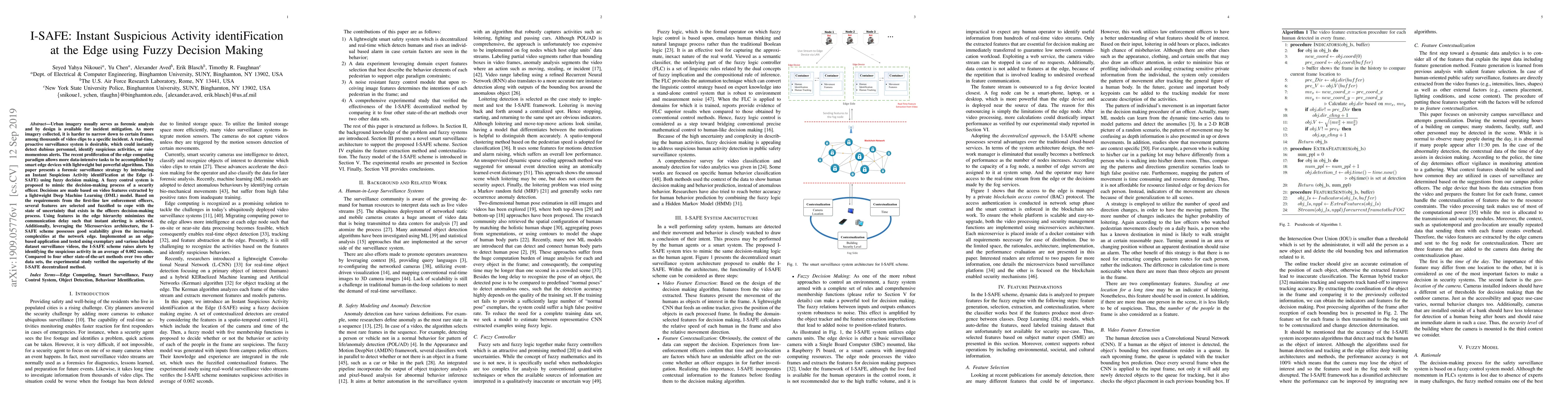 The paper introduces I-SAFE, an edge-based surveillance system using fuzzy decision making for real-time detection of suspicious activities in urban imagery. The system leverages lightweight Deep Machine Learning and a Microservices architecture for instant alerting and scalability.